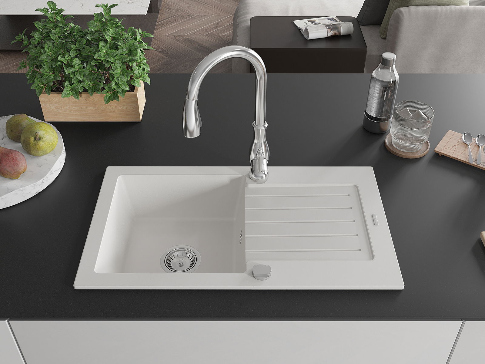 The sink is made of high quality granite. It is an elegant and, above all, practical complement to every kitchen, regardless of its style. High quality and granite durability ensure many years of use.
