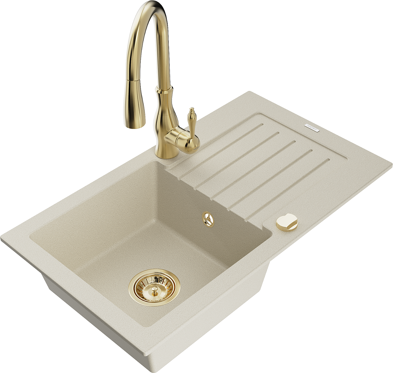 Mexen Pablo 1-bowl granite sink with drainer and Savita kitchen tap, beige - 6510-69-672601-50