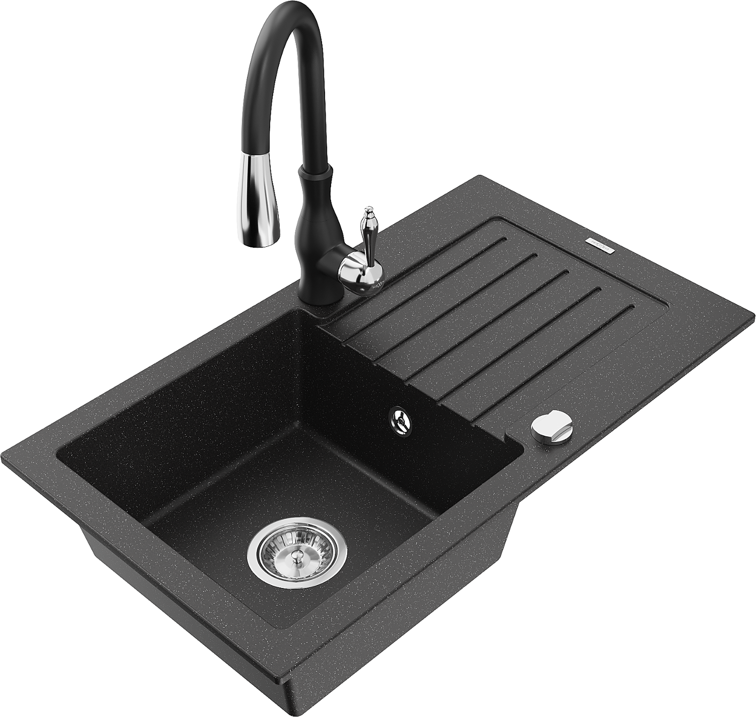 Mexen Pablo granite sink 1-bowl with drainer and Savita kitchen tap, black/silver metallic - 6510-73-672601-70