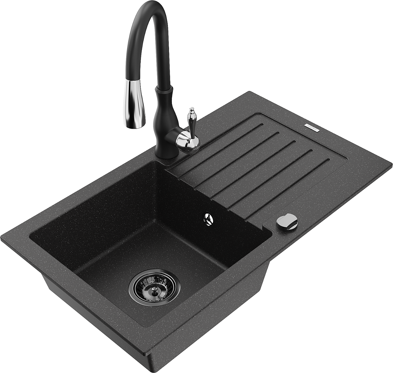 Mexen Pablo granite sink 1-bowl with drainer and Savita kitchen tap, black/silver - 6510-73-672601-70-B