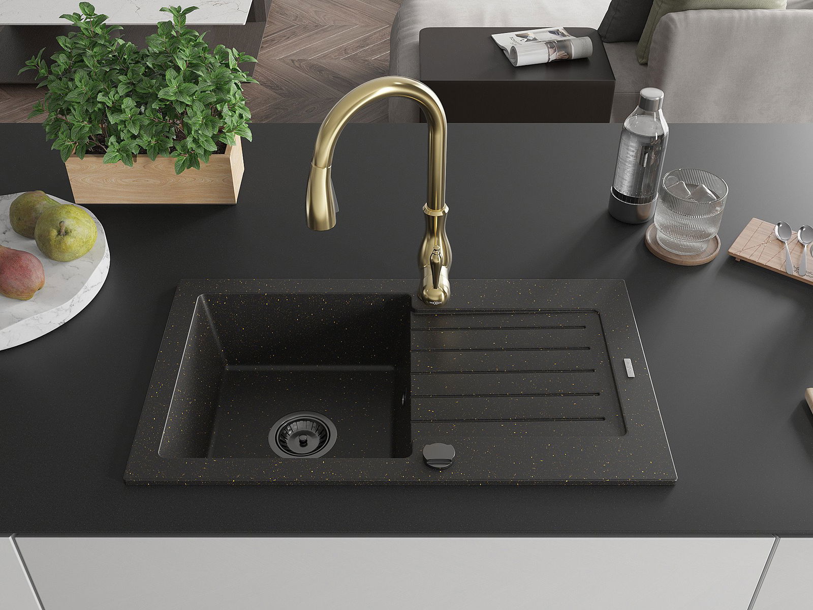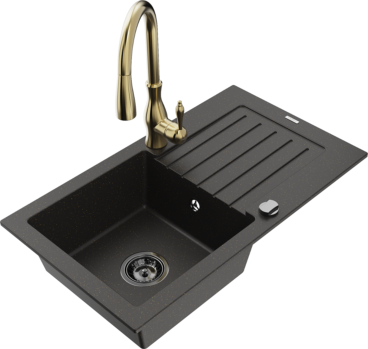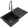 Mexen Pablo 1-Bowl Granite Kitchen Sink with Drainer and Savita Kitchen Mixer, Black/Gold Metallic - 6510-75-672601-50-B