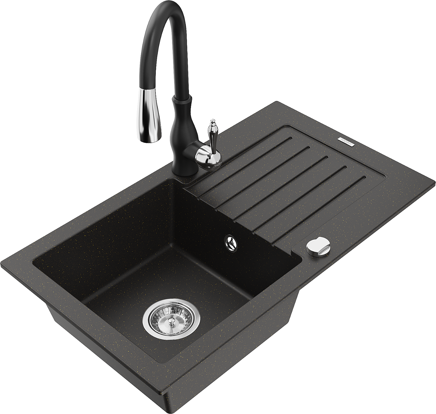 Mexen Pablo granite kitchen sink with 1 bowl, drainer and Savita kitchen tap, black/gold metallic - 6510-75-672601-70
