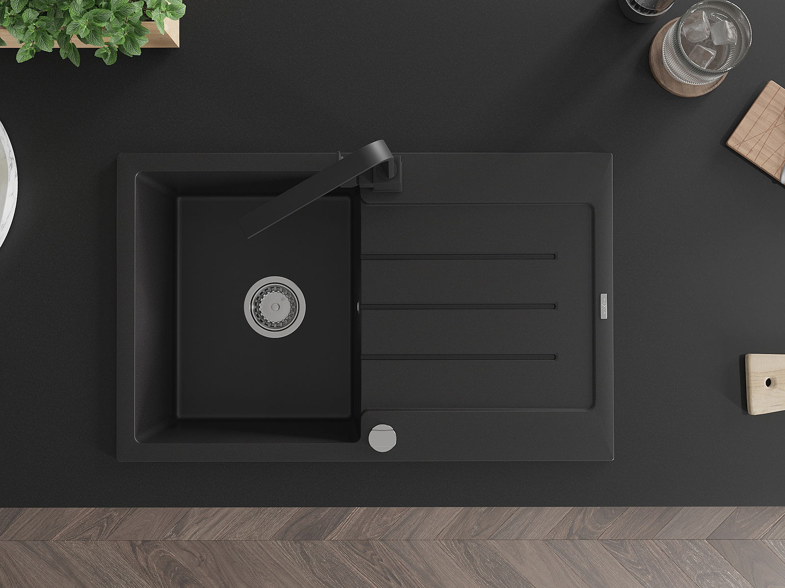 Mexen Bruno 1-bowl granite sink with drainer and Rita kitchen tap, black - 6513-77-670300-70