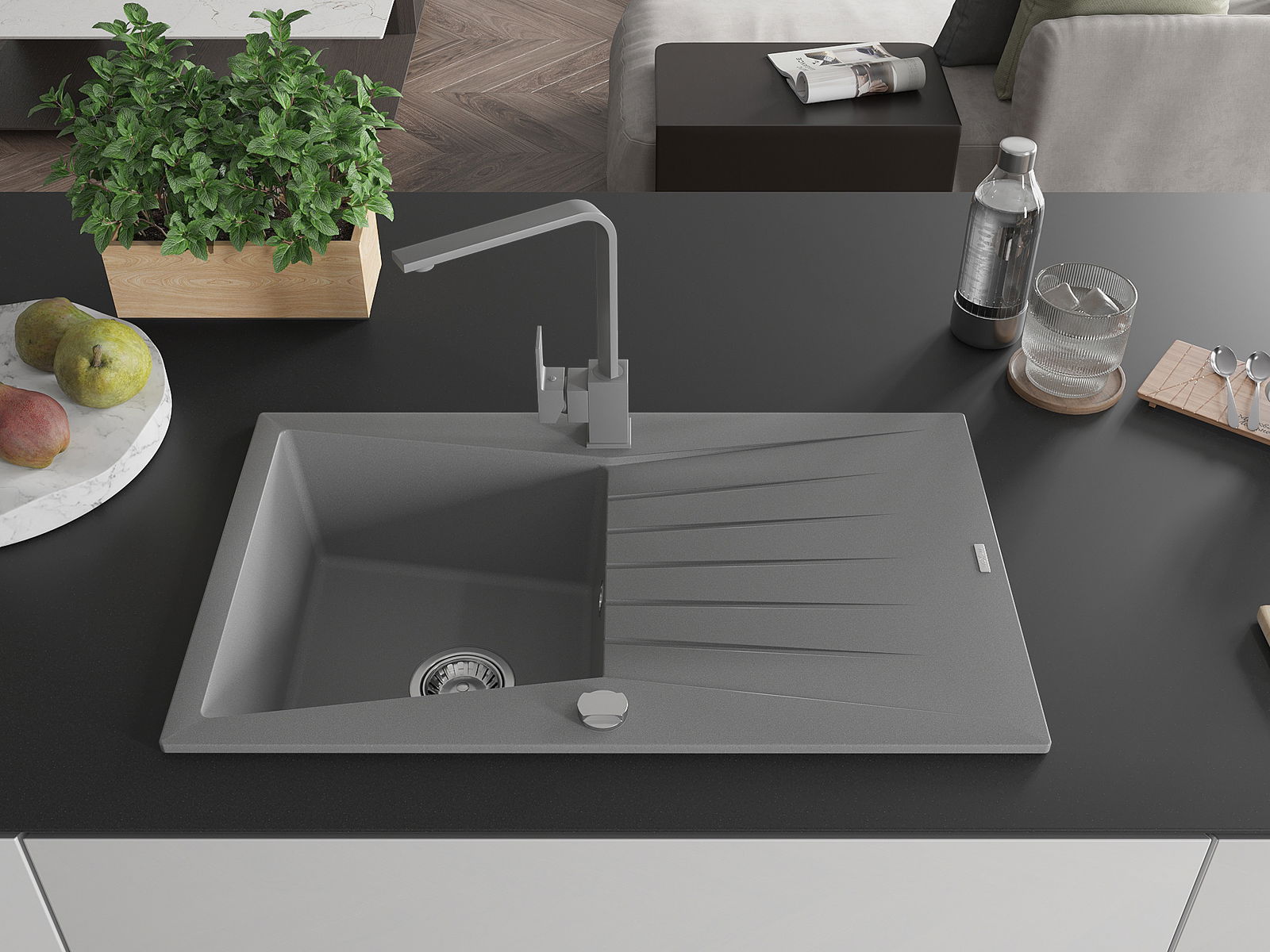 Mexen Cesar single-bowl granite sink with drainer and Rita kitchen tap, grey - 6514-71-670300-71