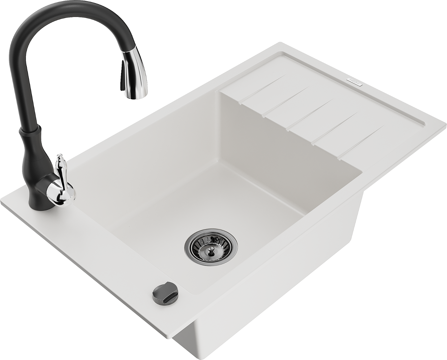 Mexen Elias 1-bowl granite sink with drainer and Savita kitchen mixer tap, white - 6511-20-672601-70