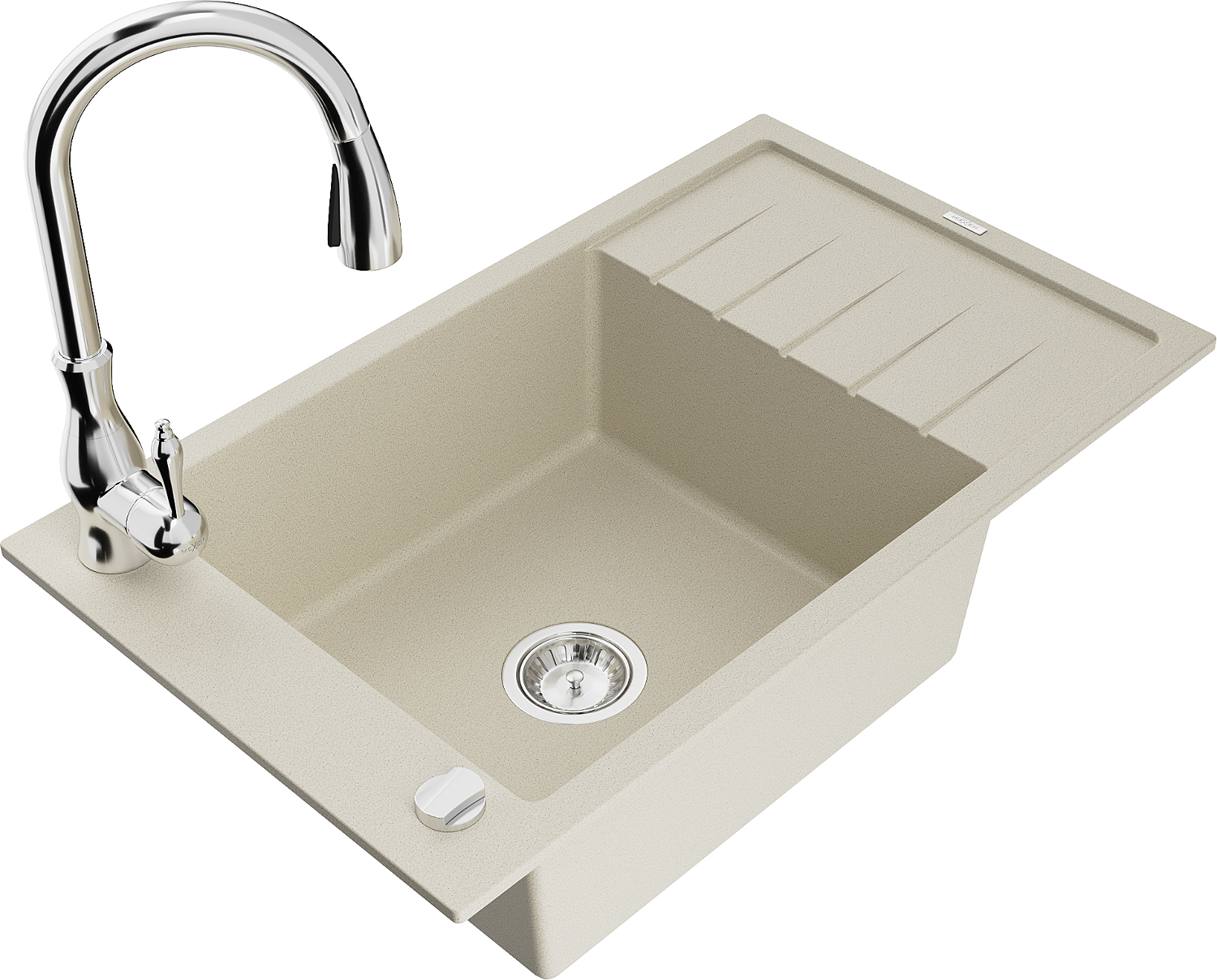 Mexen Elias 1-Bowl Granite Sink with Drainer and Savita Kitchen Tap, Beige - 6511-69-672601-00