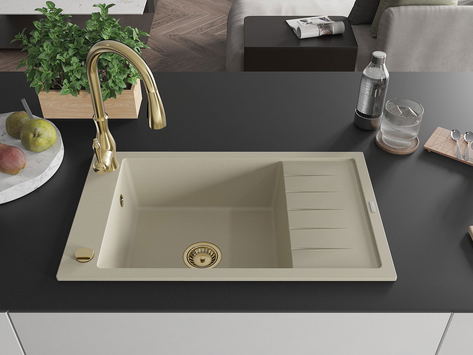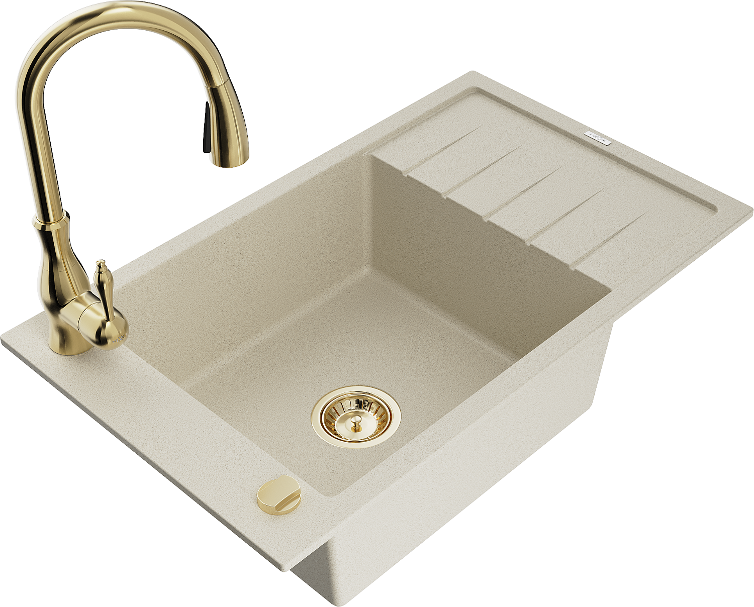 Mexen Elias 1-bowl granite sink with drainer and Savita kitchen tap, beige - 6511-69-672601-50