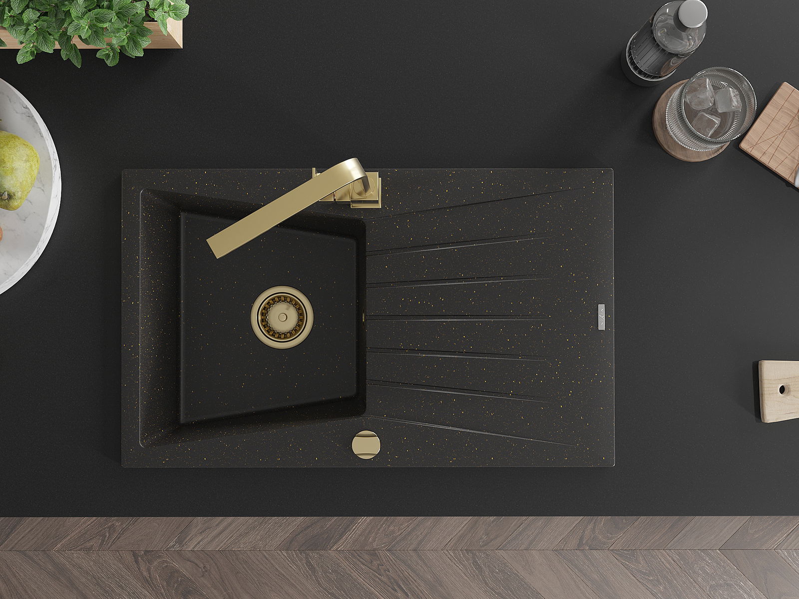 Mexen Cesar granite sink 1-bowl with drainer and Rita kitchen tap, black/gold metallic - 6514-75-670300-50
