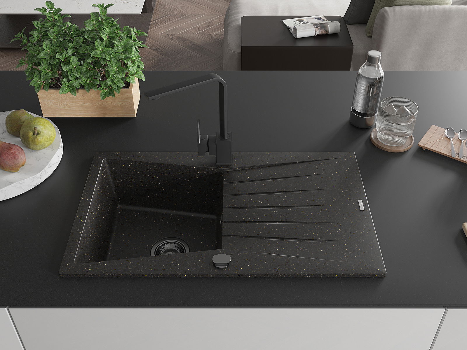Mexen Cesar granite sink 1-bowl with drainer and kitchen tap Rita, black/gold metallic - 6514-75-670300-70-B