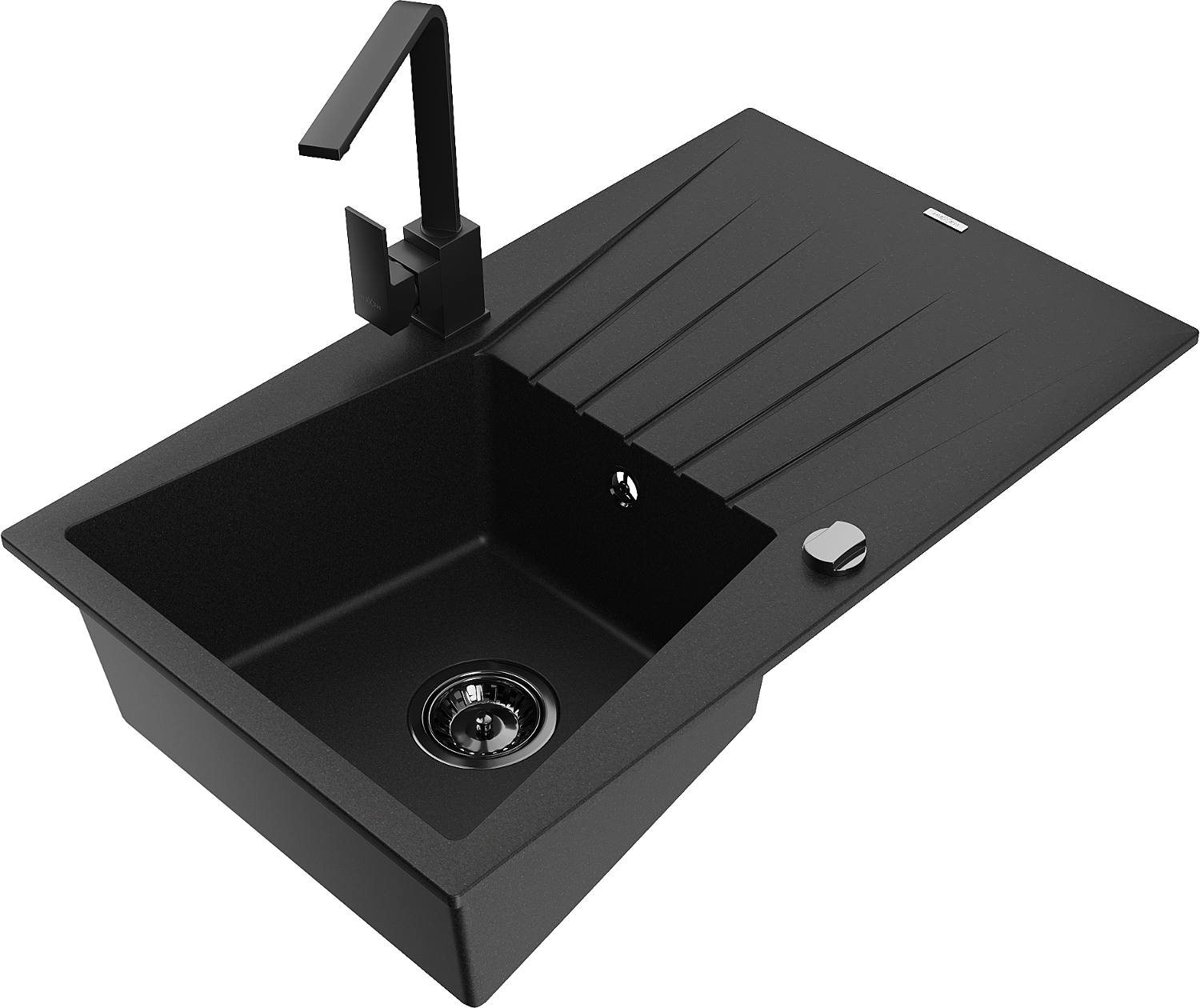Mexen Cesar granite sink 1-bowl with drainer and Rita kitchen tap, black - 6514-77-670300-70-B