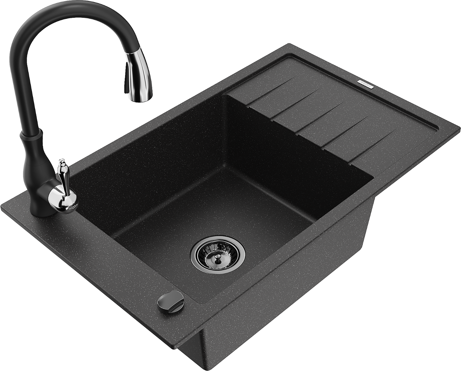 Mexen Elias granite sink 1-bowl with drainer and Savita kitchen tap, black/silver metallic- 6511-73-672601-70-B