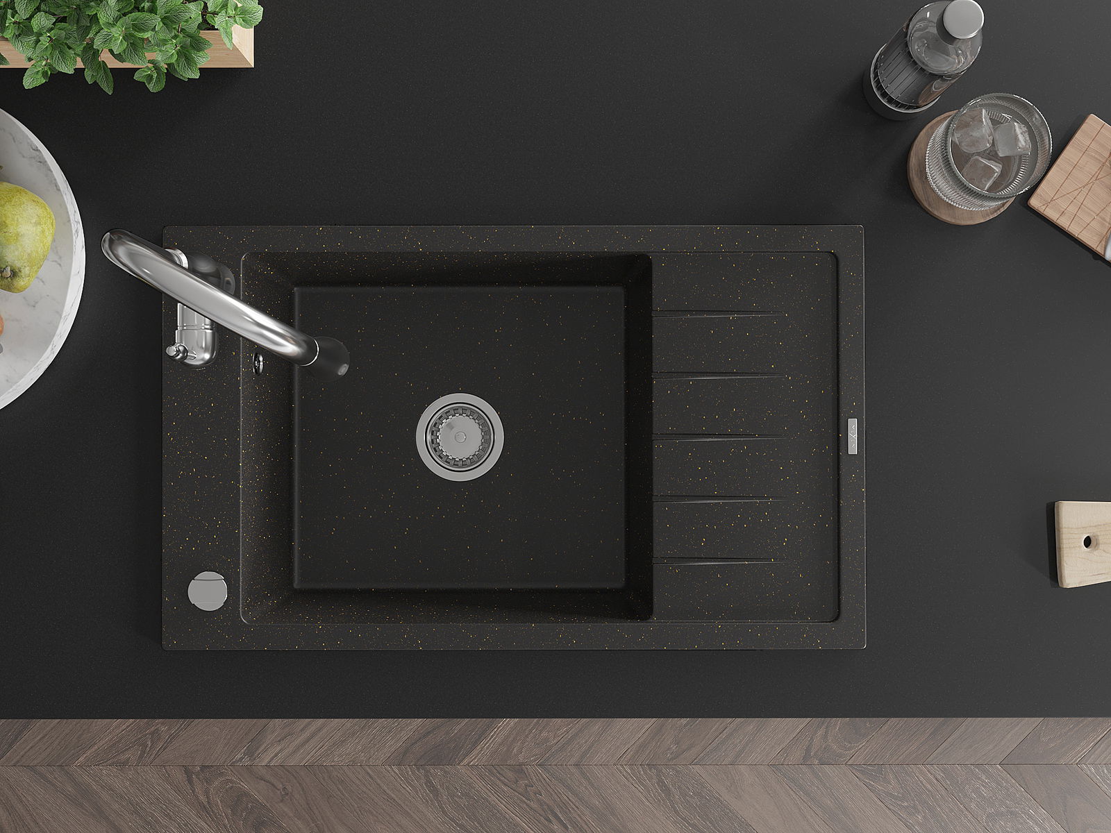 Mexen Elias granite sink 1-bowl with drainer and Savita kitchen tap, black/gold metallic- 6511-75-672601-00