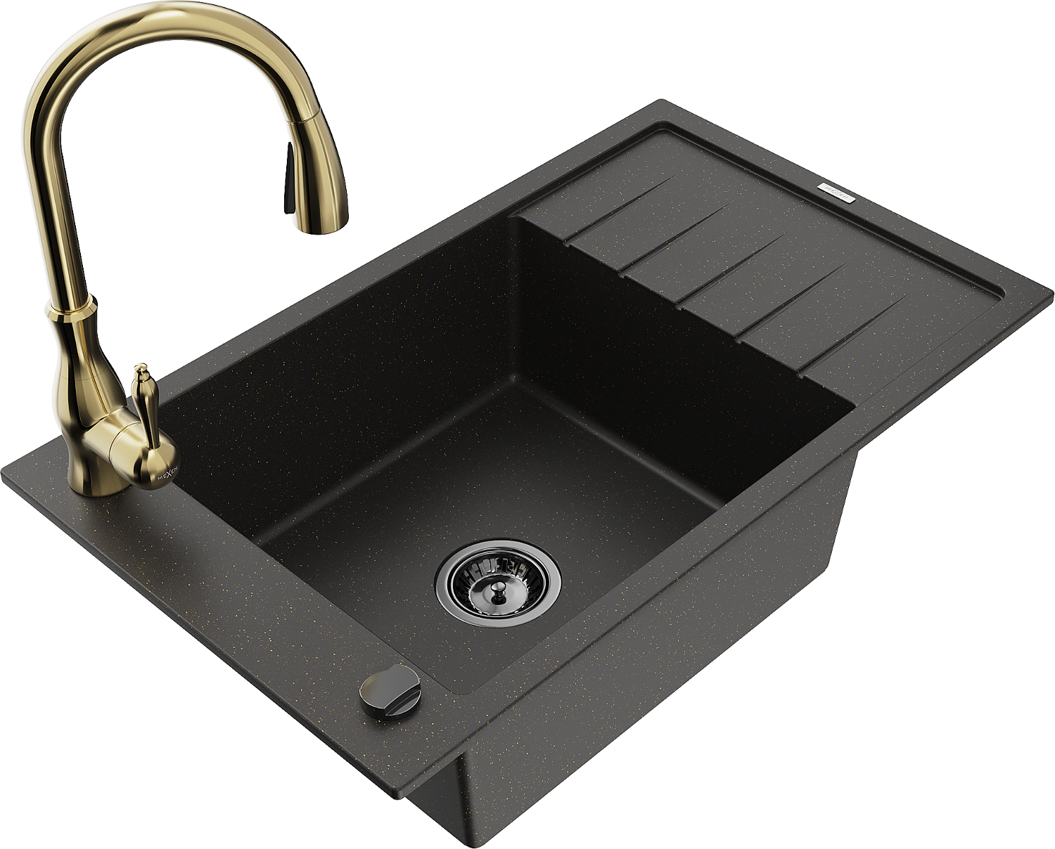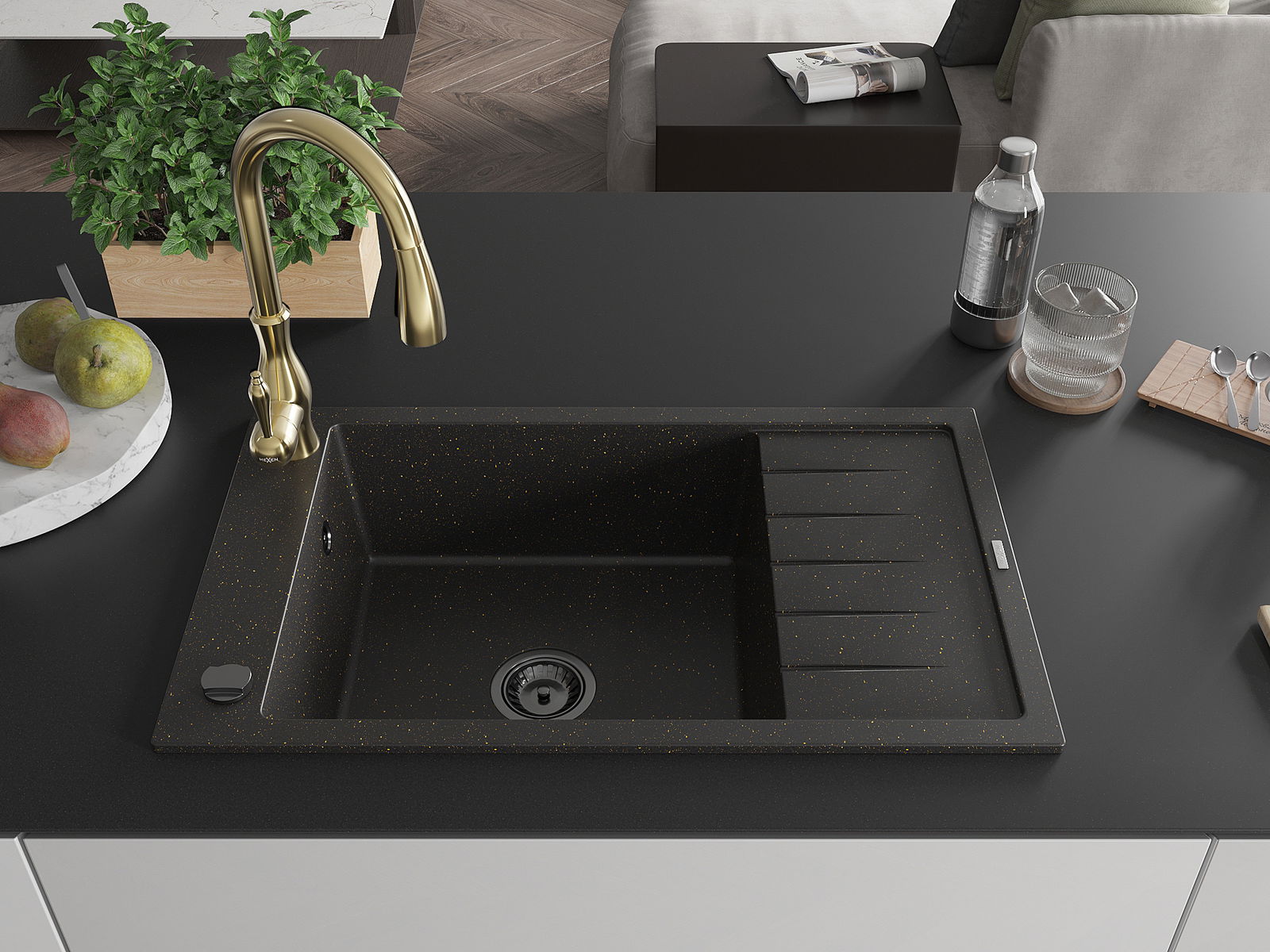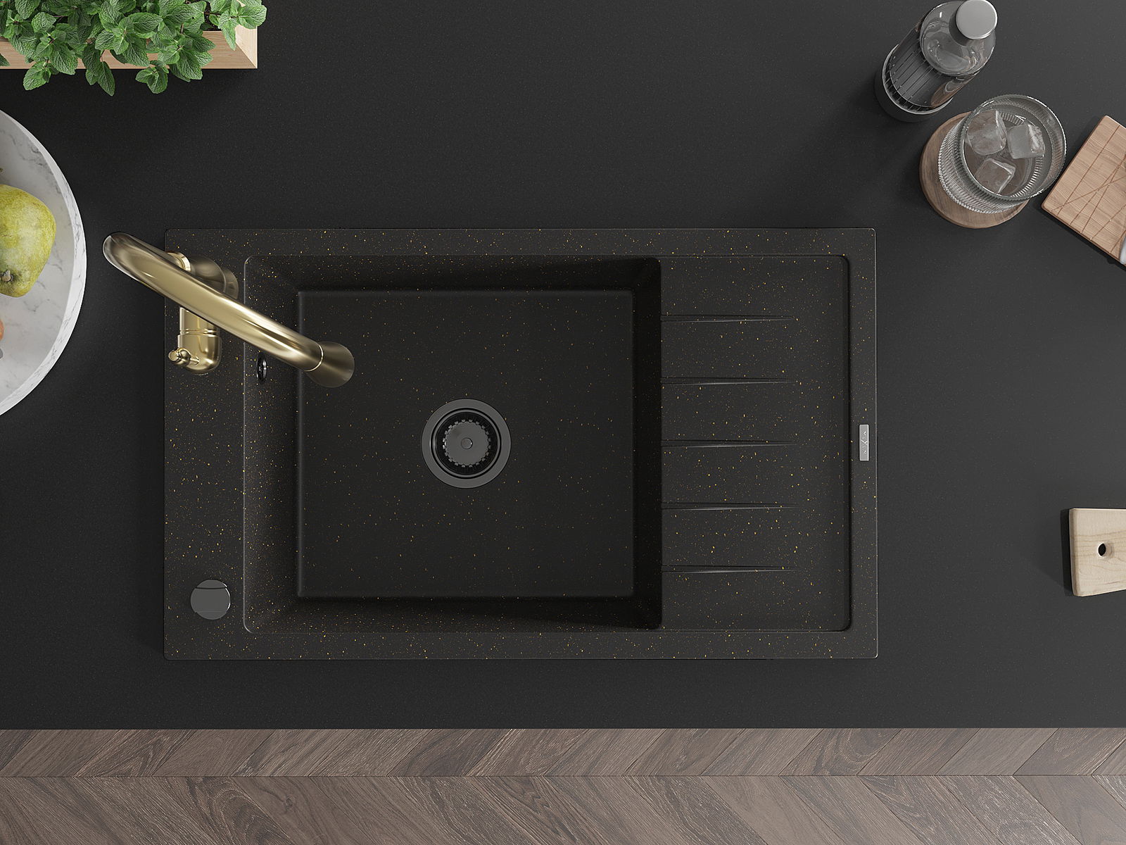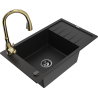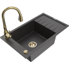 Mexen Elias granite kitchen sink 1-bowl with drainer and Savita kitchen tap, black/gold metallic - 6511-75-672601-50-B