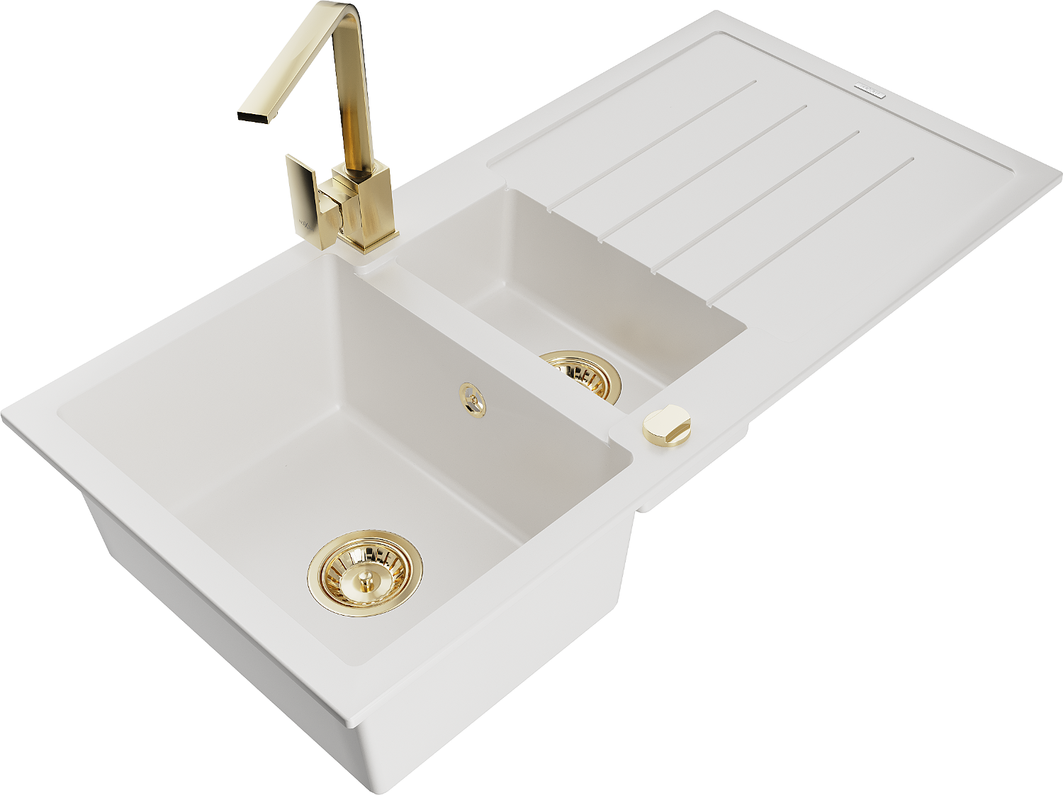 Mexen Andres granite sink 1.5-bowl with drainer and Rita kitchen tap, white - 6515-20-670300-50