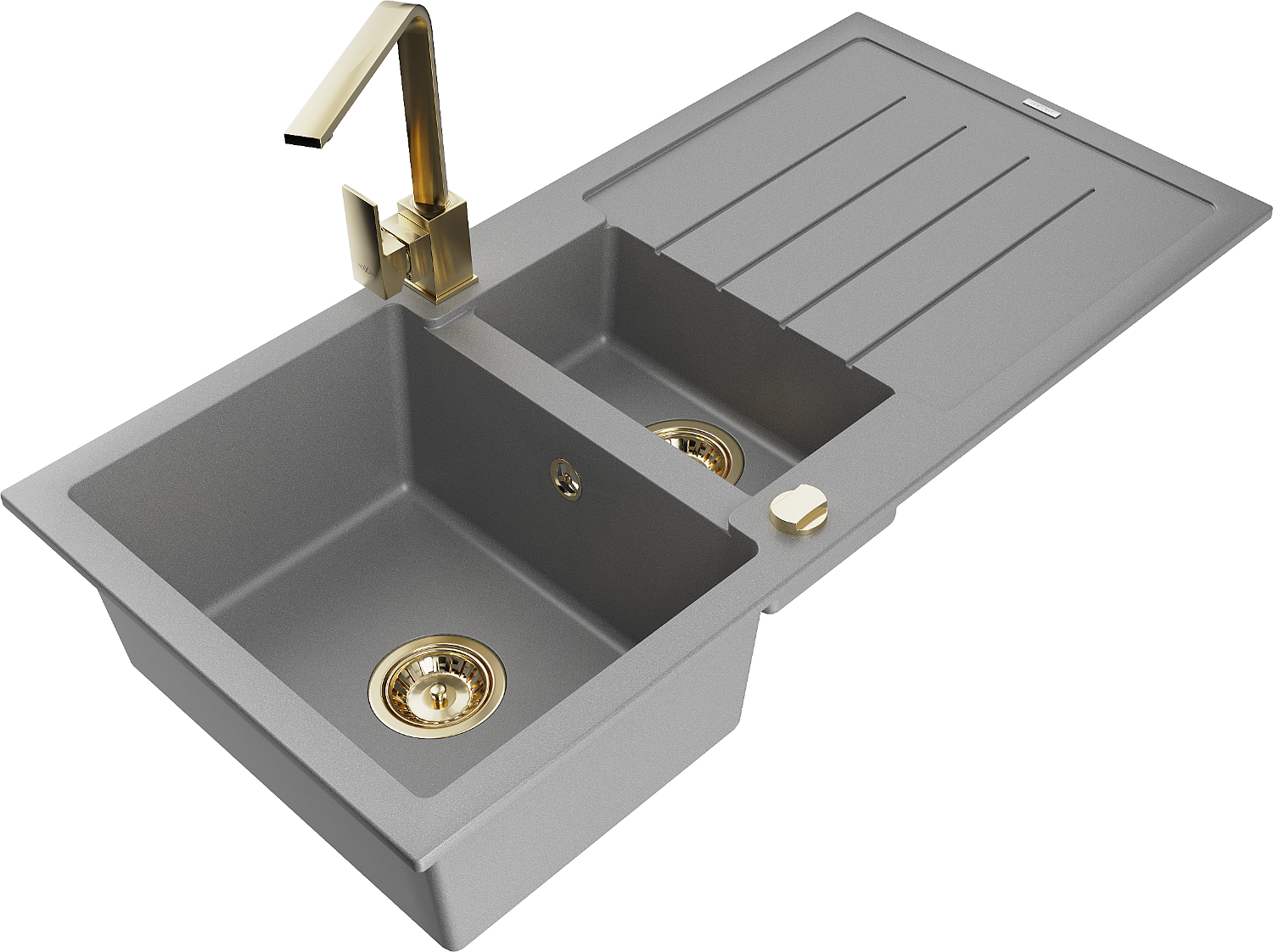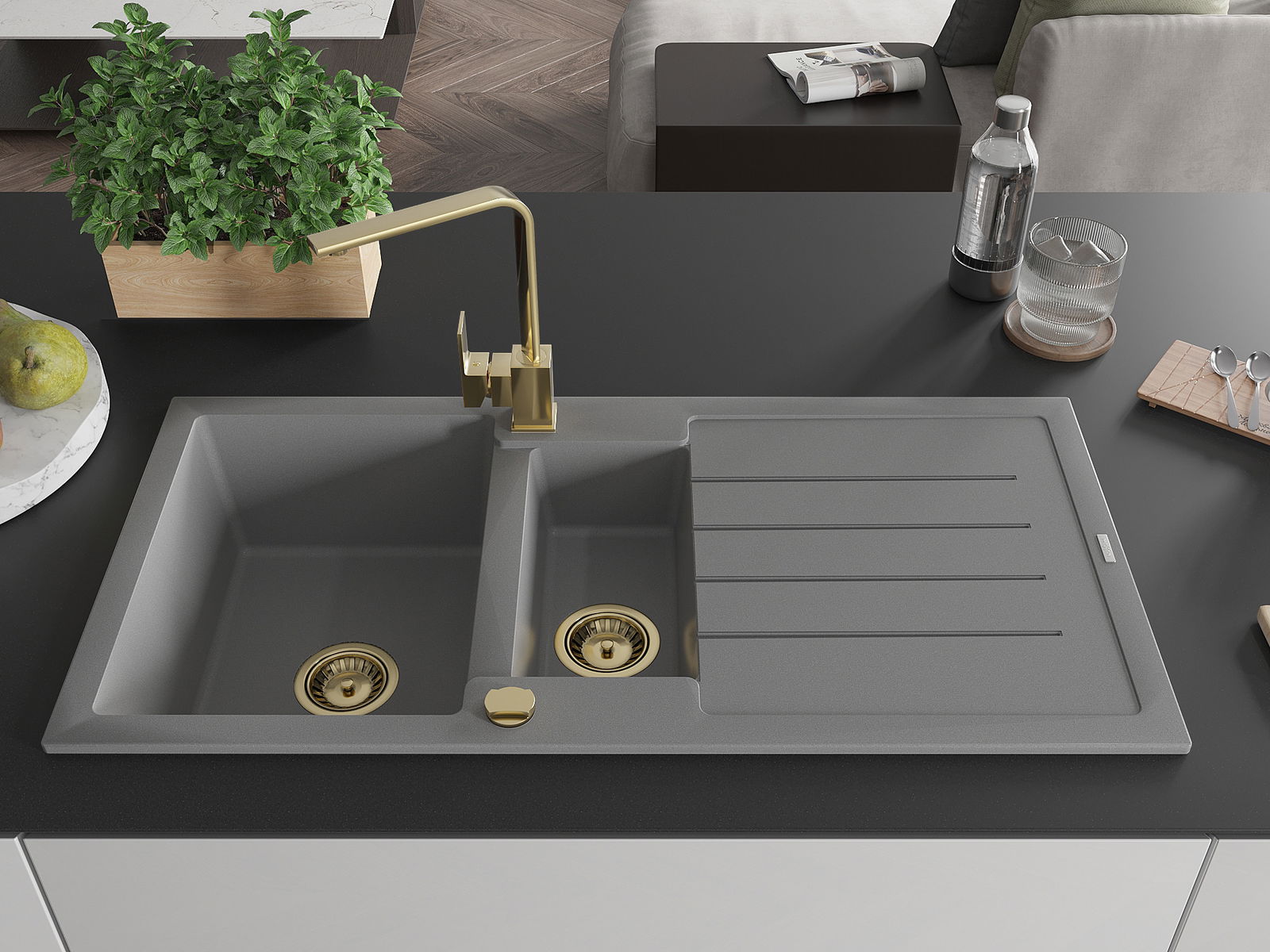 Mexen Andres granite sink 1.5-bowl with drainer and Rita kitchen tap, grey - 6515-71-670300-50