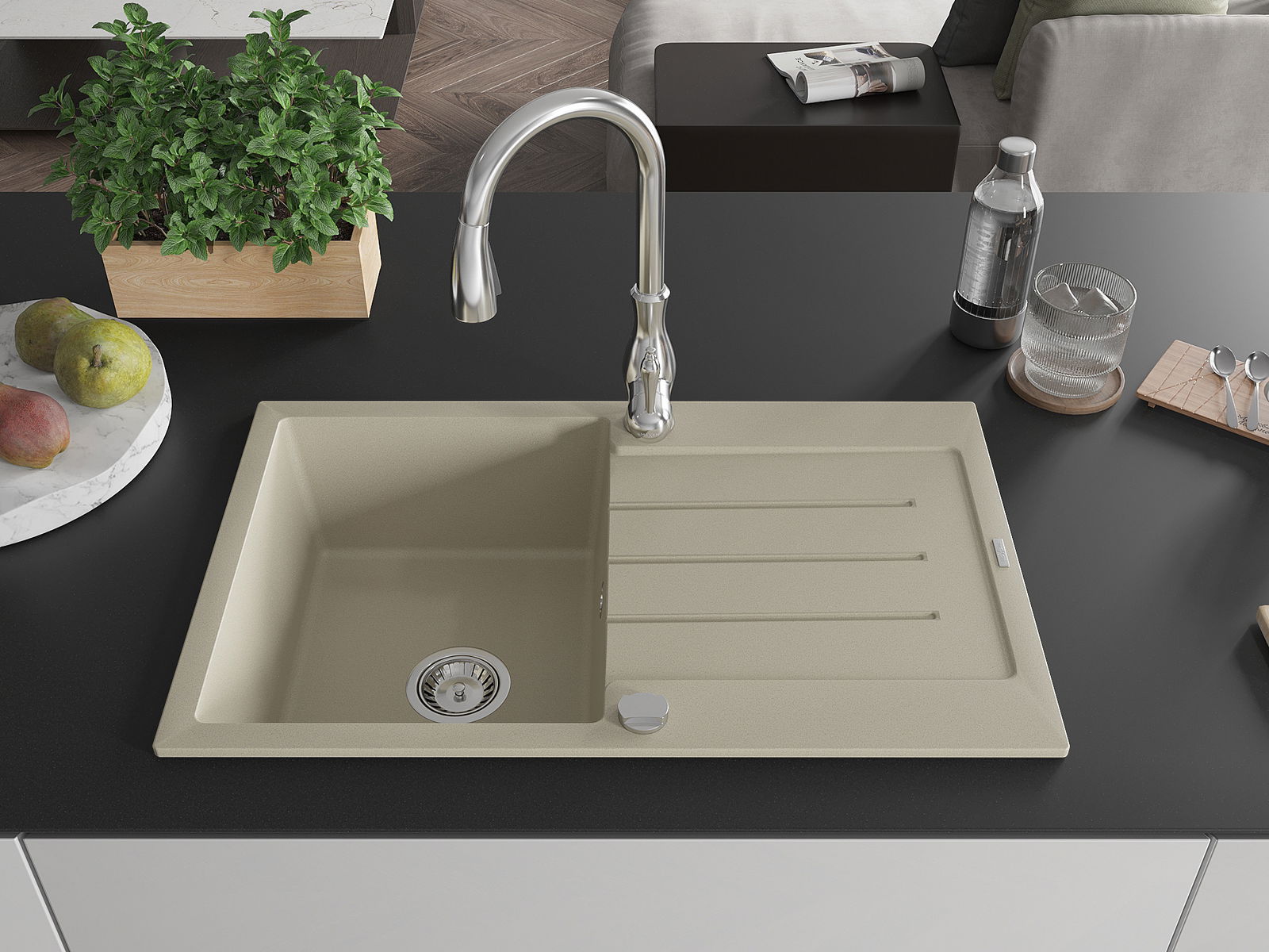 The sink is made of high quality granite. It is an elegant and, above all, practical complement to every kitchen, regardless of its style. High quality and granite durability ensure many years of use.