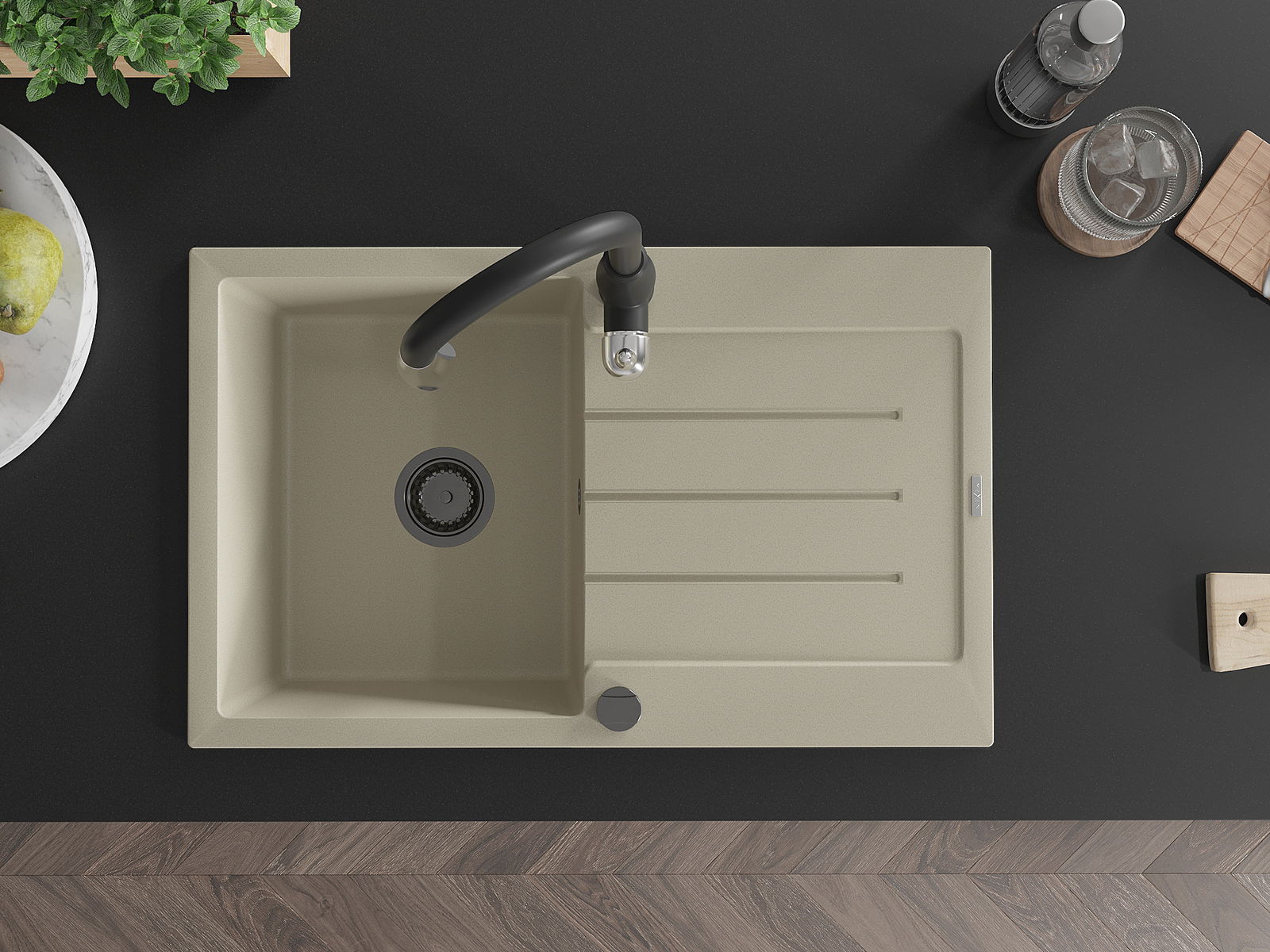 Mexen Bruno 1-bowl granite sink with drainer and Savita kitchen tap, beige - 6513-69-672601-70