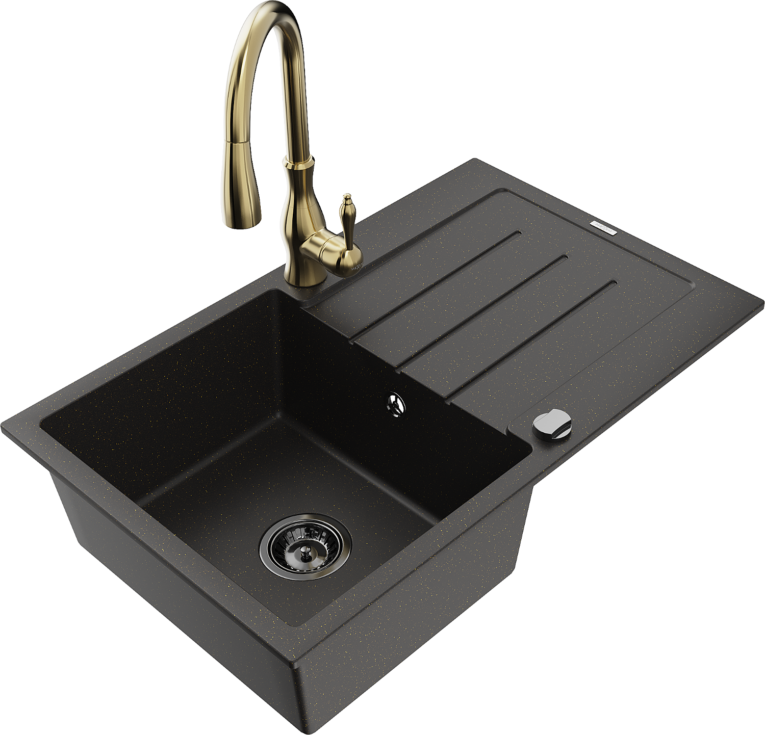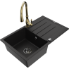 Mexen Bruno granite sink 1-bowl with drainer and Savita kitchen tap, black/golden metallic - 6513-75-672601-50-B