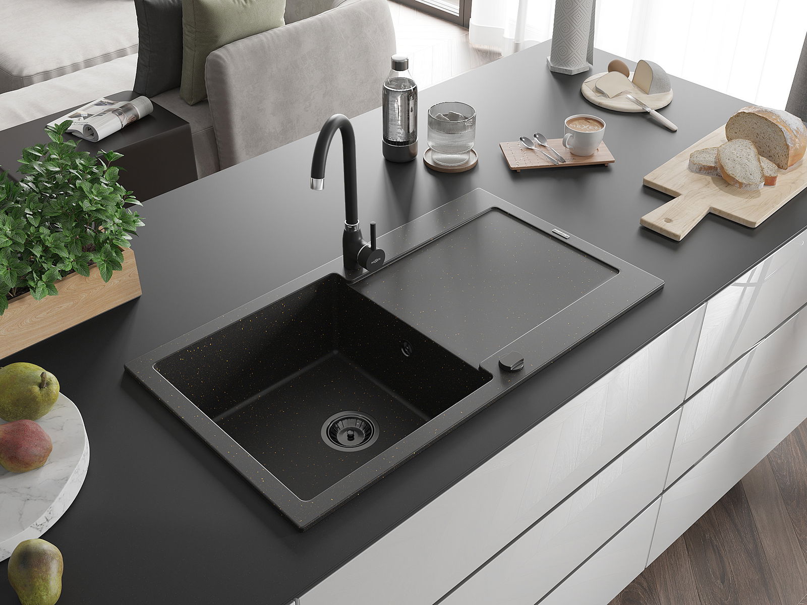 The sink is made of high quality granite. It is an elegant and, above all, practical complement to every kitchen, regardless of its style. High quality and granite durability ensure many years of use.