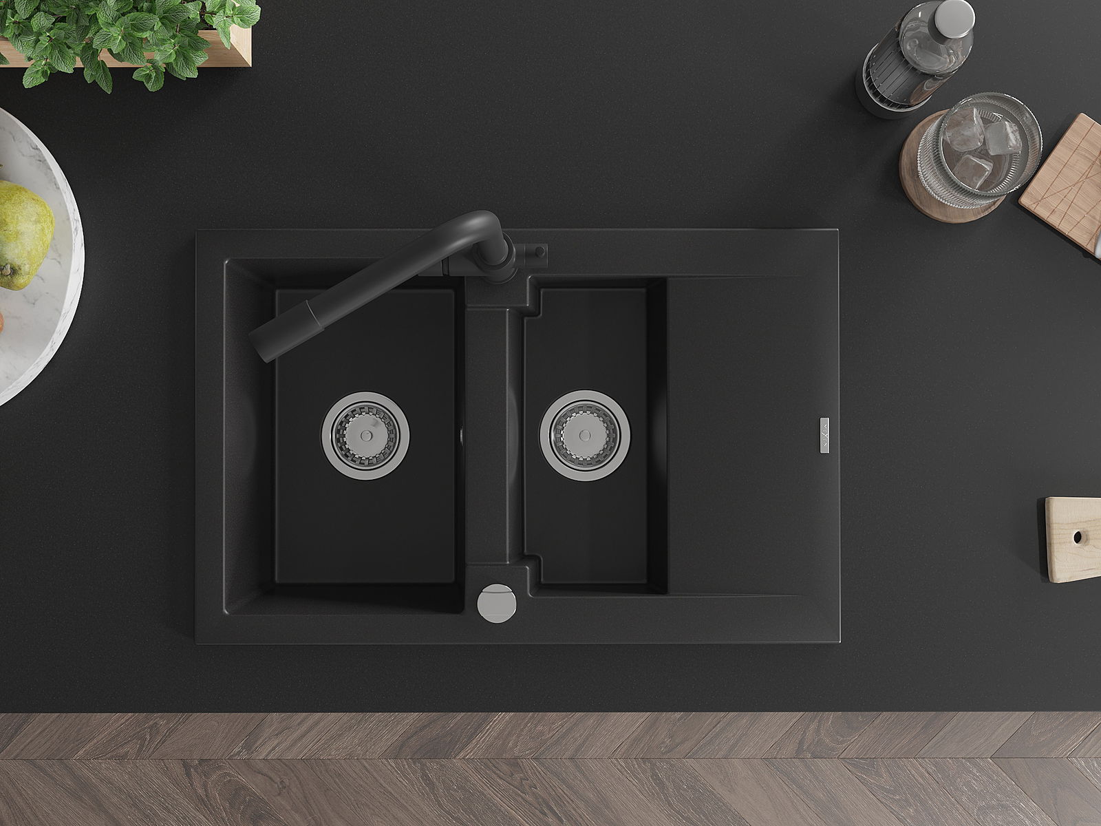Mexen Gaspar granite kitchen sink 1.5-bowl with drainer and Duero kitchen tap, black - 6507-77-671600-70