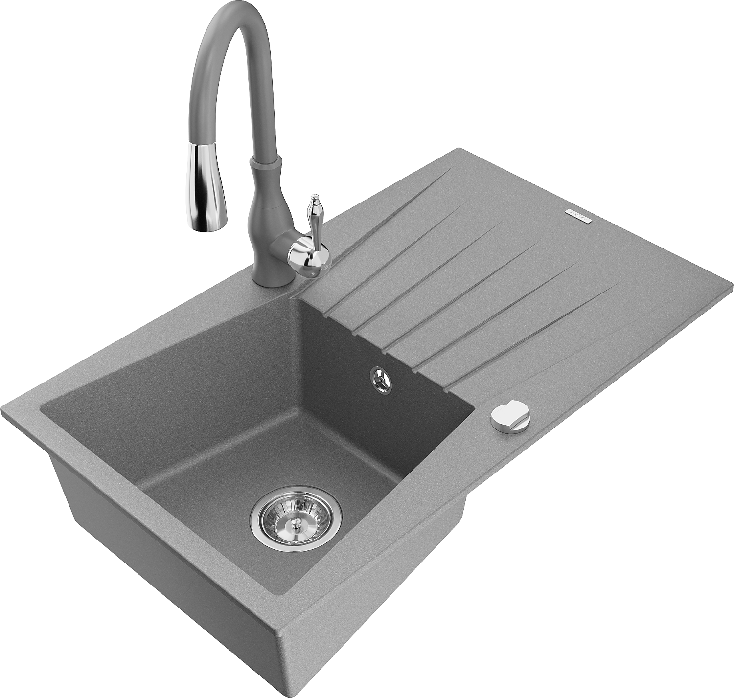 Mexen Cesar 1-bowl granite sink with drainer and Savita kitchen tap, grey - 6514-71-672601-71