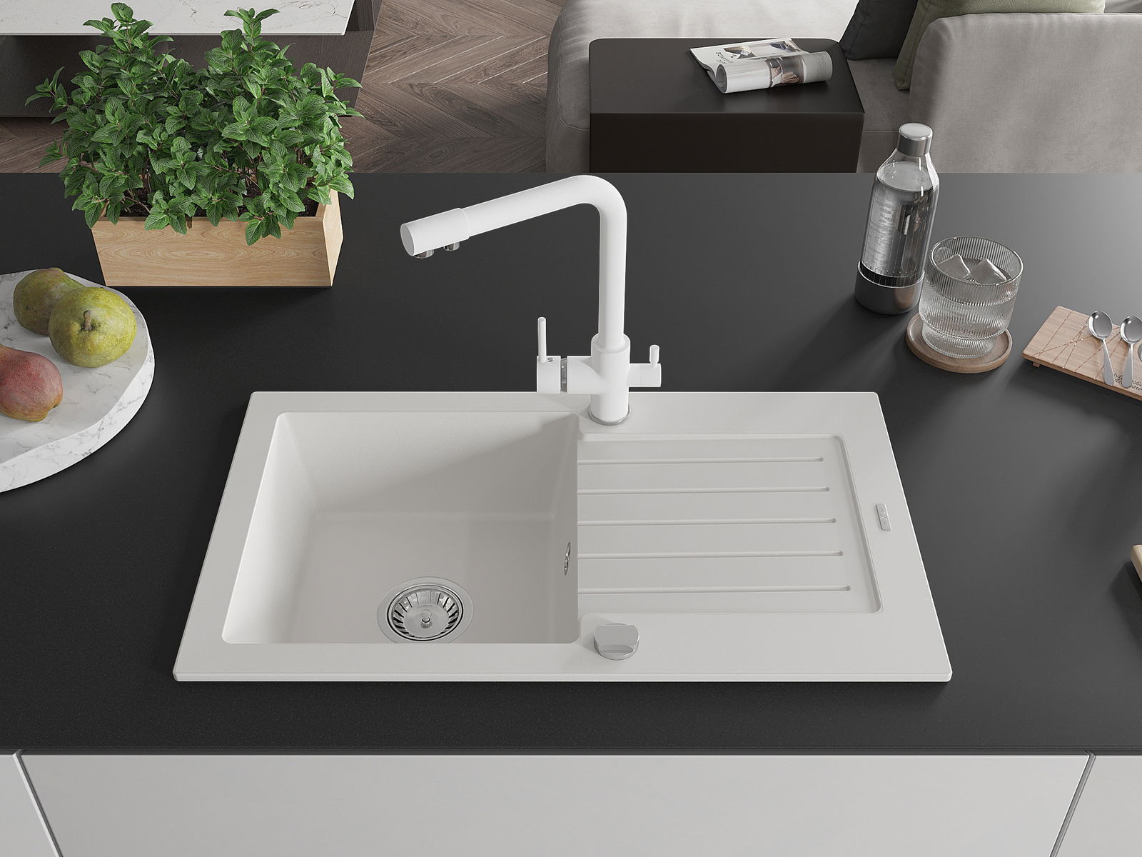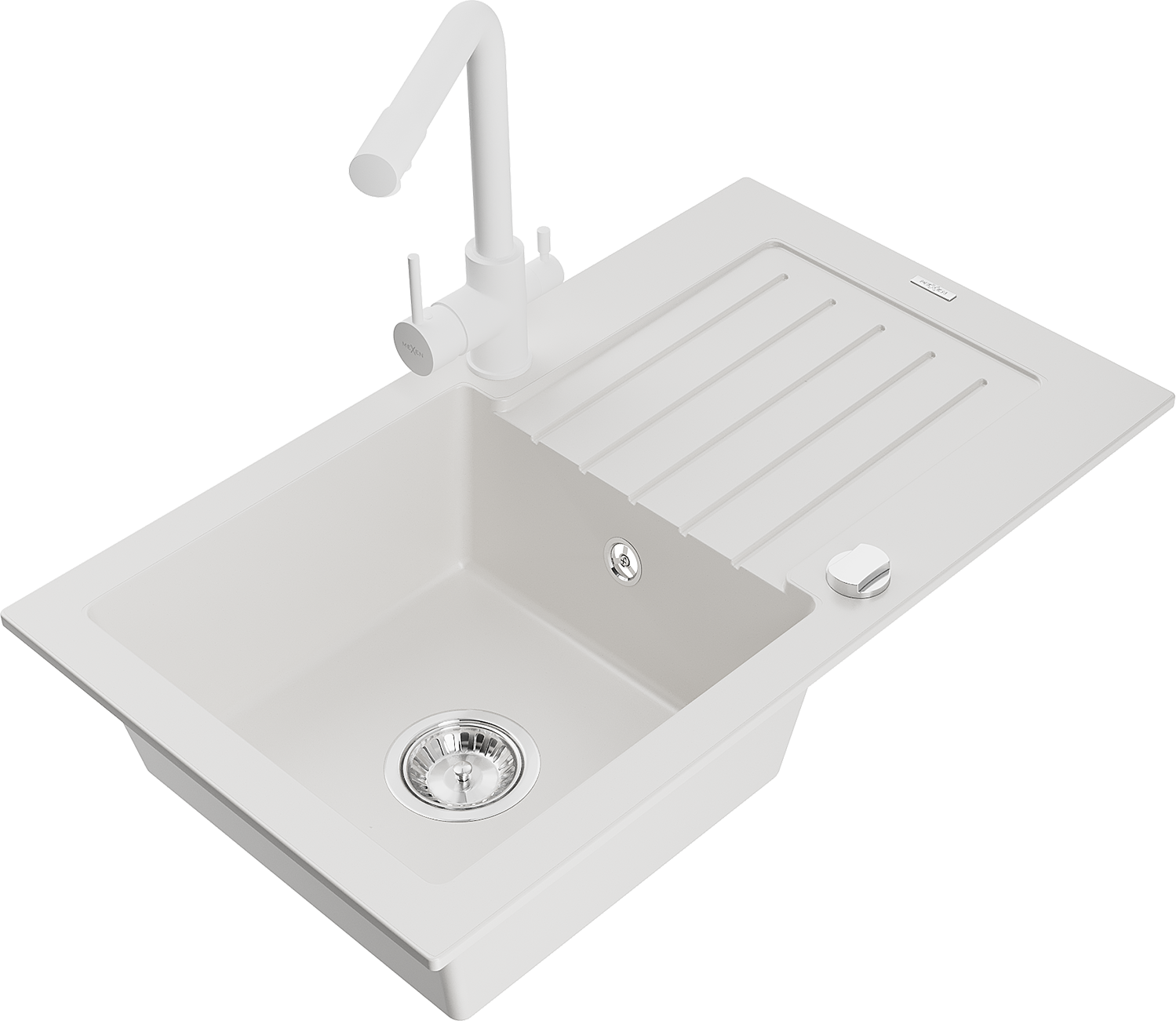 Mexen Pablo granite kitchen sink 1-bowl with drainer and Duero kitchen tap, white - 6510-20-671600-20