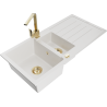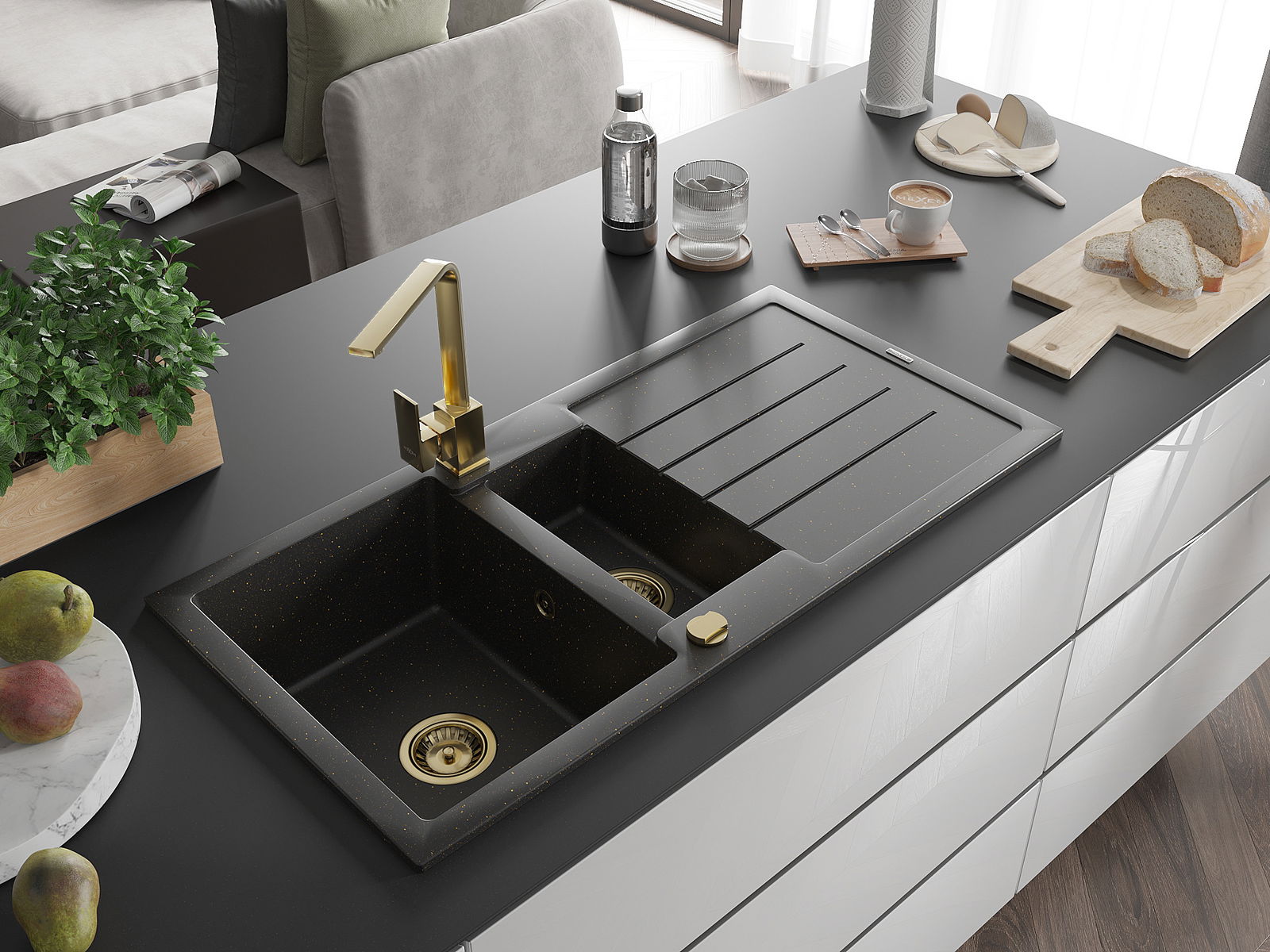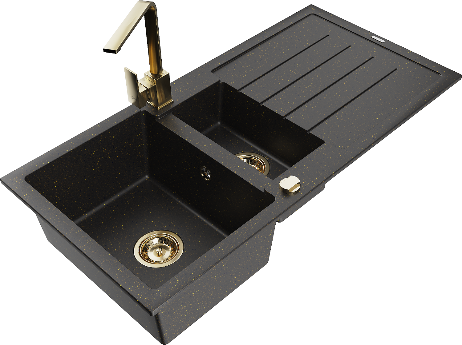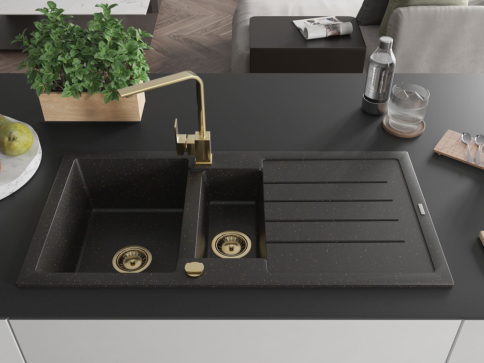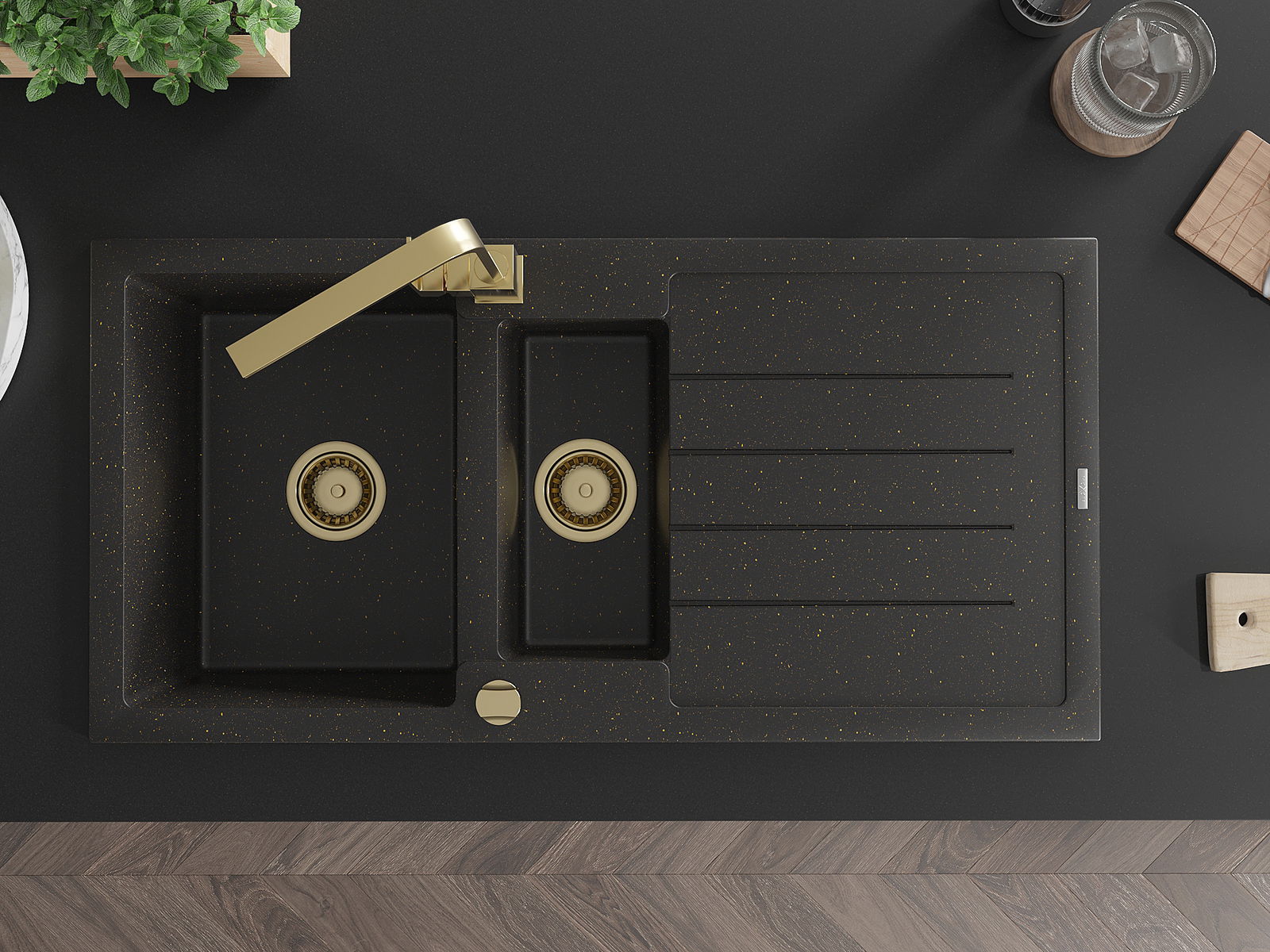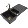 Mexen Andres granite sink 1.5-bowl with drainer and Rita kitchen tap, black/gold metallic- 6515-75-670300-50