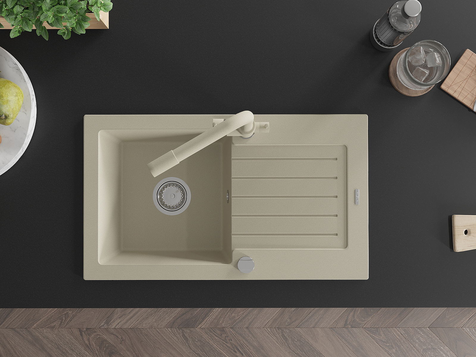 Mexen Pablo 1-bowl granite kitchen sink with drainer and Duero kitchen tap, beige - 6510-69-671600-69