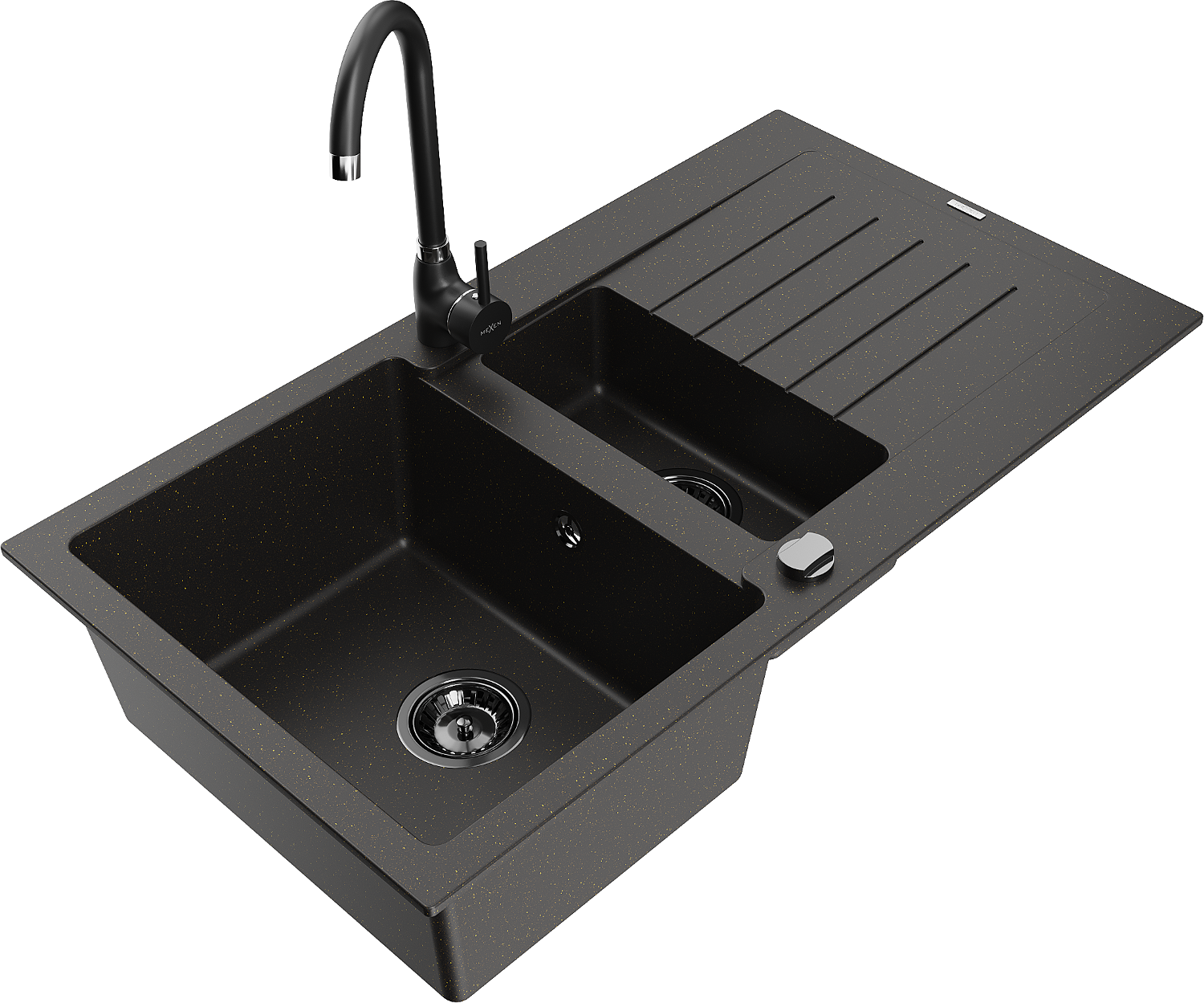 Mexen Matias 1.5-bowl granite sink with draining board and Telma kitchen tap, black/gold - 6502-75-670200-70-B