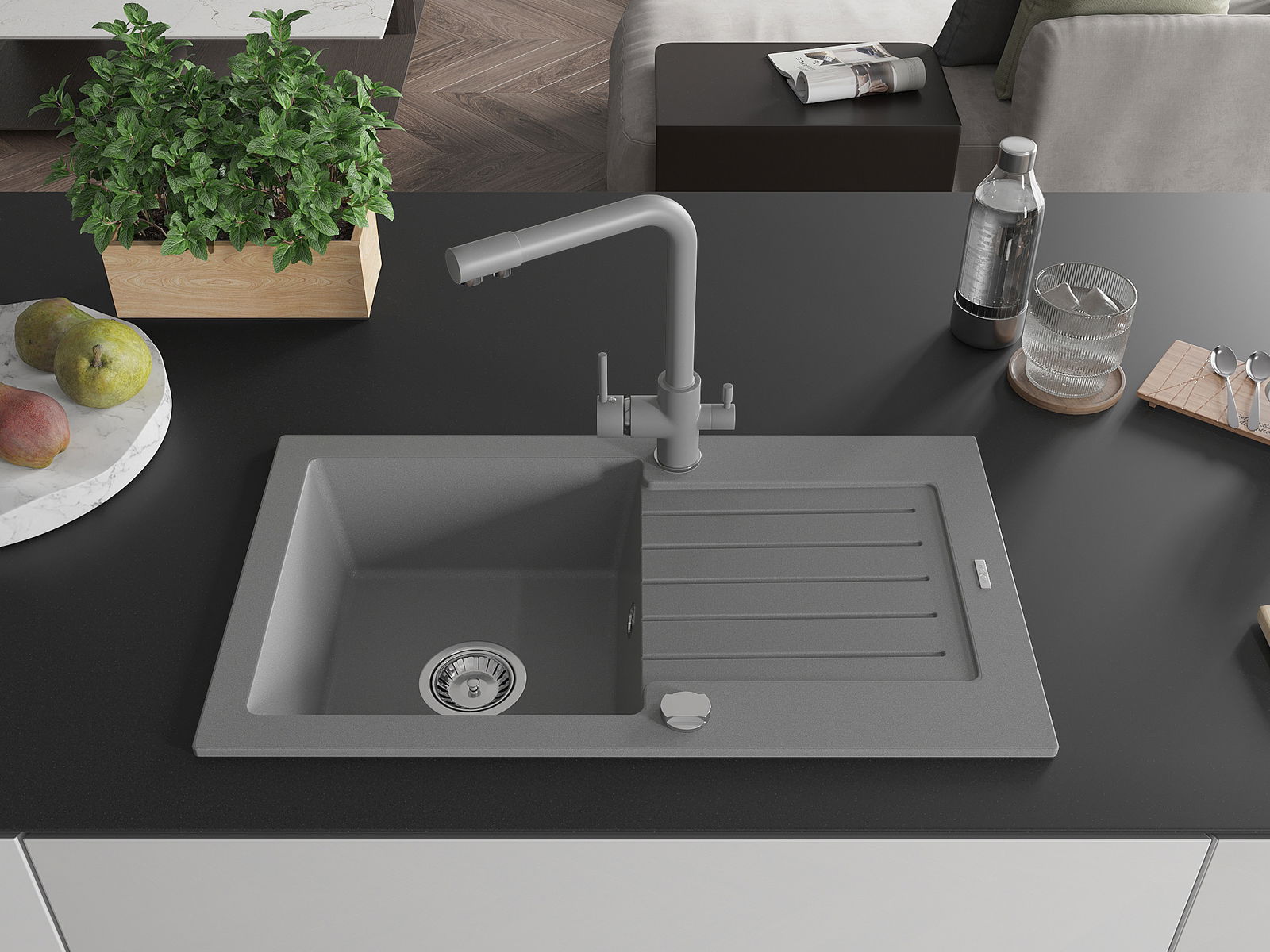 Mexen Pablo 1-bowl granite sink with drainer and Duero kitchen tap, grey - 6510-71-671600-71