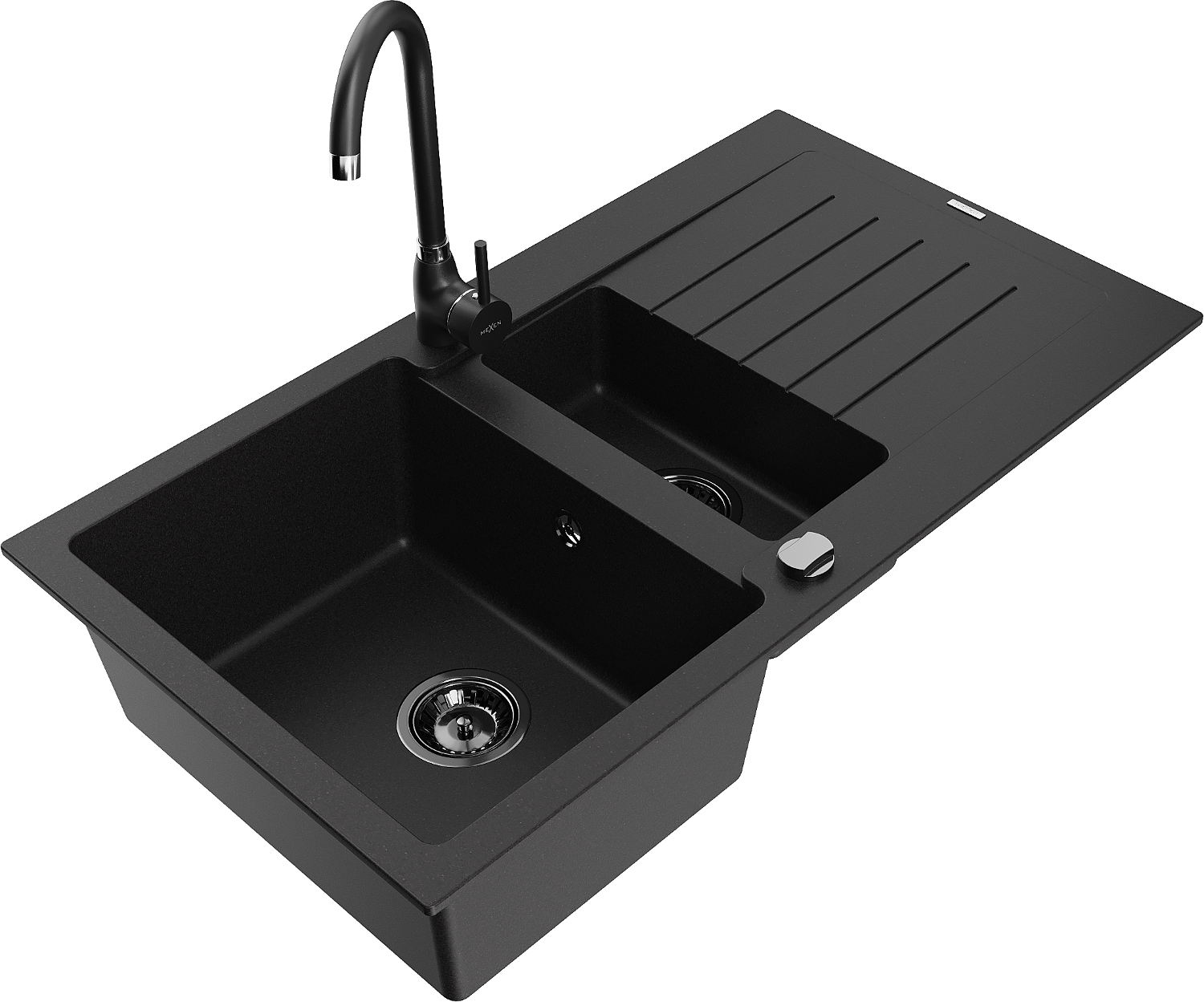 Mexen Matias granite sink 1.5-bowl with drainer and Telma kitchen tap, black - 6502-77-670200-70-B