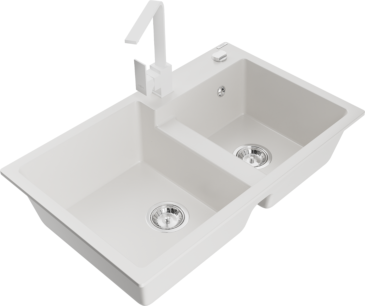 Mexen Tomas granite sink 2-bowl with kitchen faucet Rita, white - 6516-20-670300-20