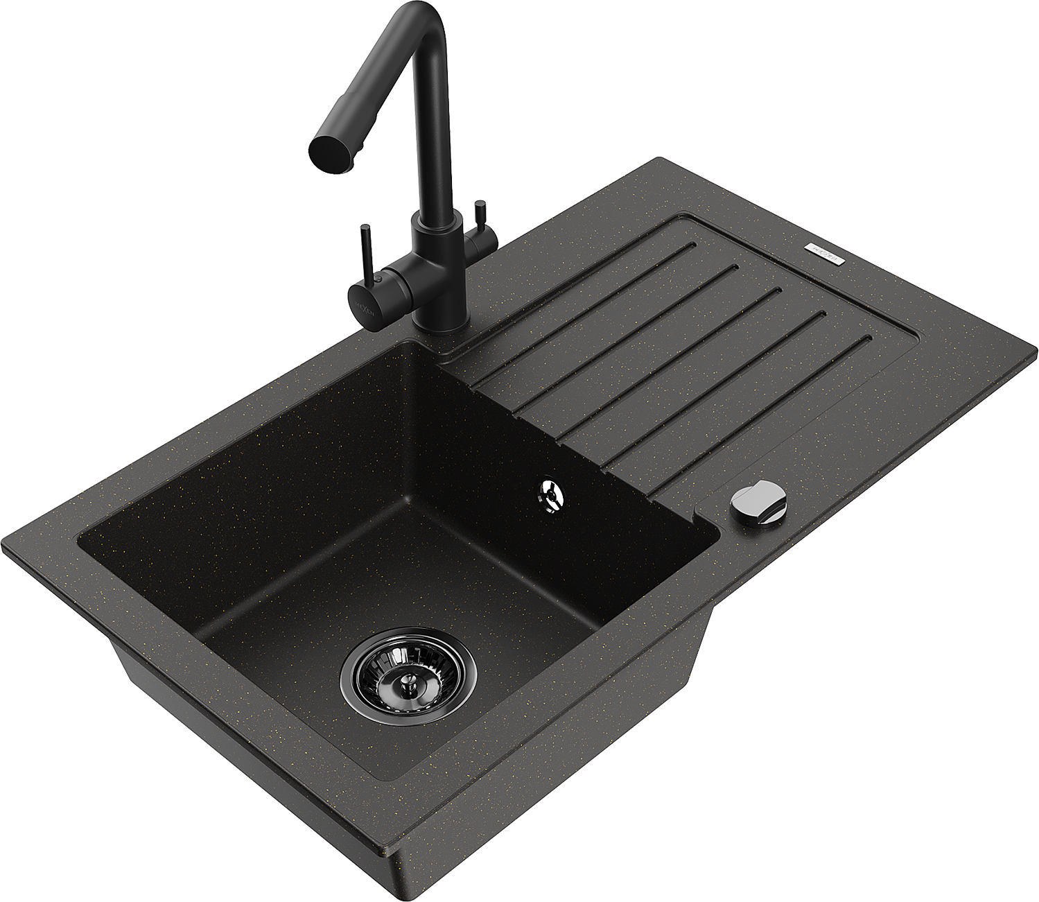 Mexen Pablo granite sink 1-bowl with drainer and Duero kitchen tap, black/gold metallic - 6510-75-671600-70-B