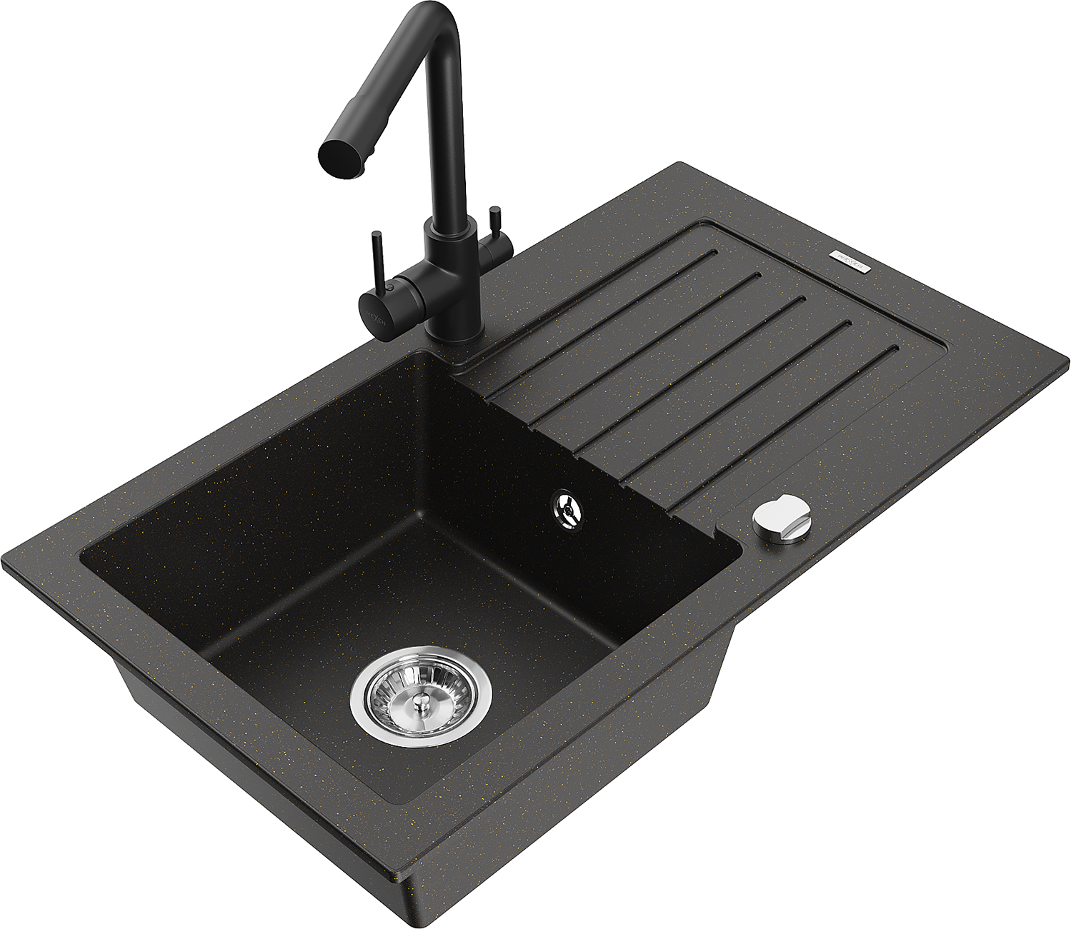 Mexen Pablo granite sink single-bowl with drainer and Duero kitchen tap, black/gold metallic - 6510-75-671600-70