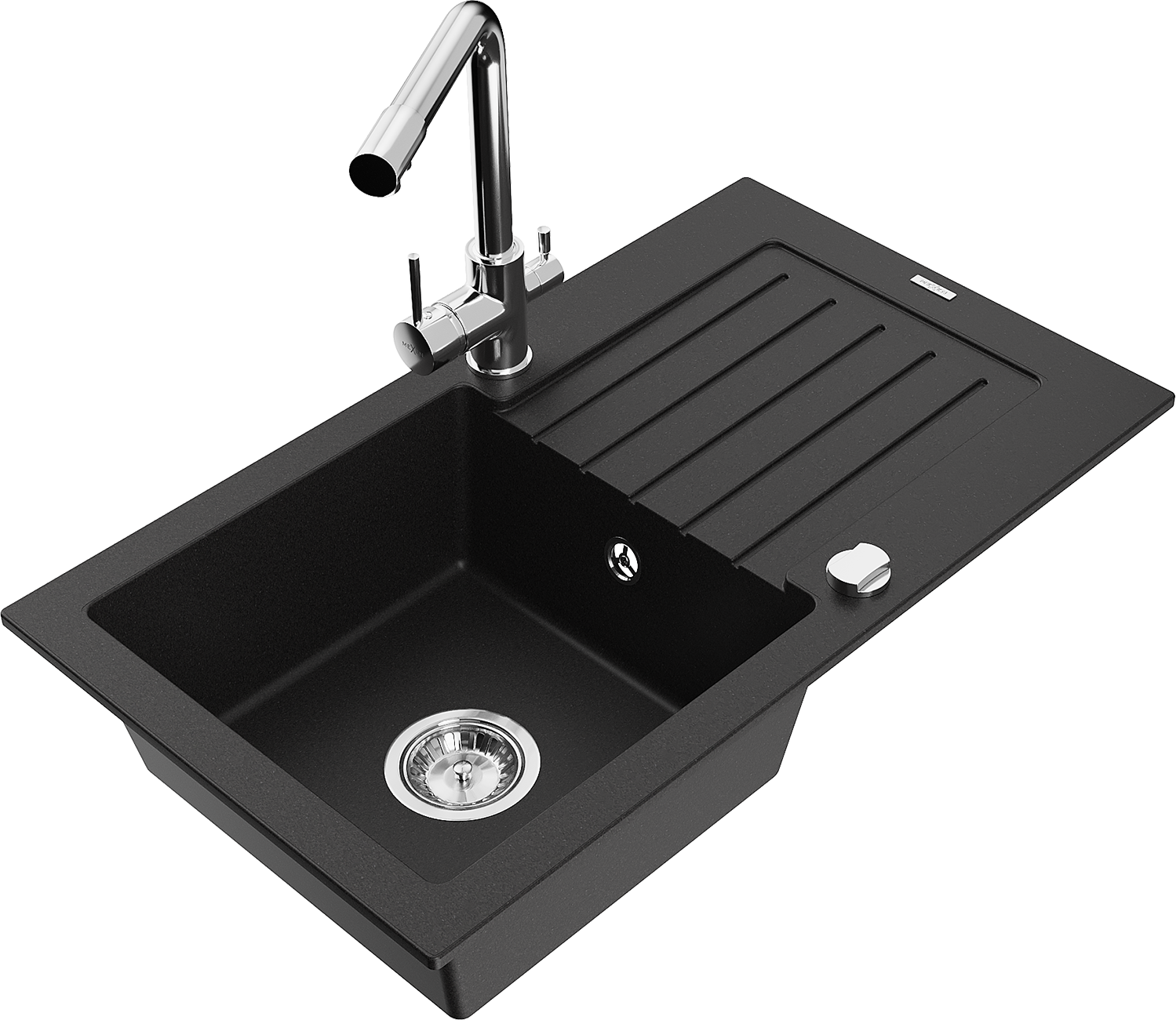 Mexen Pablo granite sink 1-bowl with drainer and Duero kitchen tap, black - 6510-77-671600-00