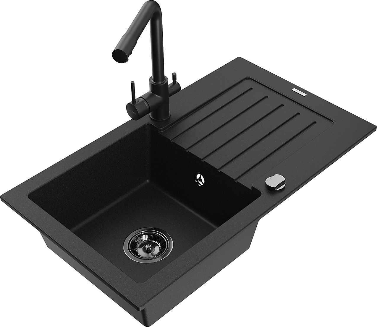 Mexen Pablo granite sink 1-bowl with drainer and Duero kitchen tap, black - 6510-77-671600-70-B