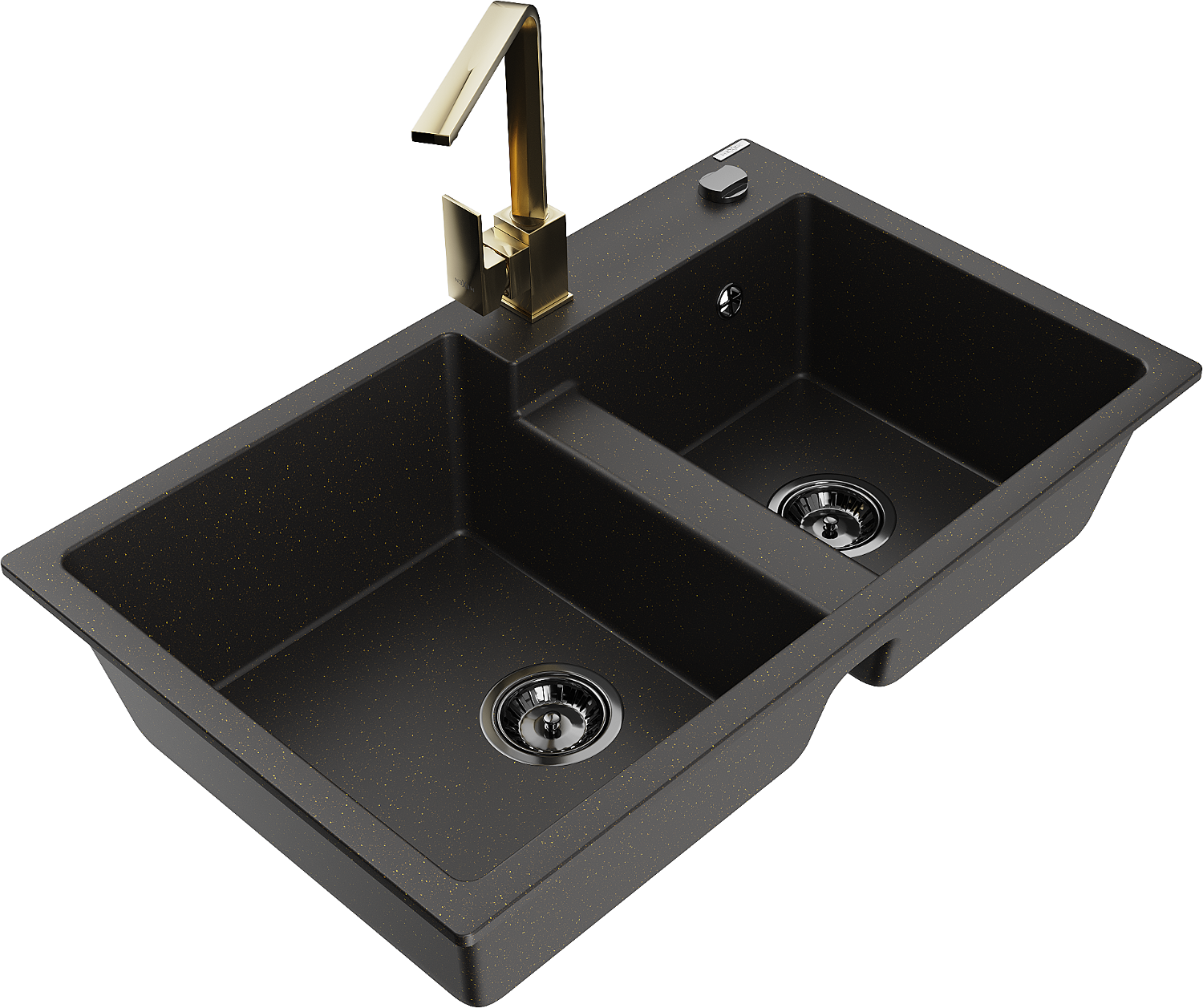 Mexen Tomas granite sink 2-chamber with Rita kitchen tap, black/gold metallic - 6516-75-670300-50-B