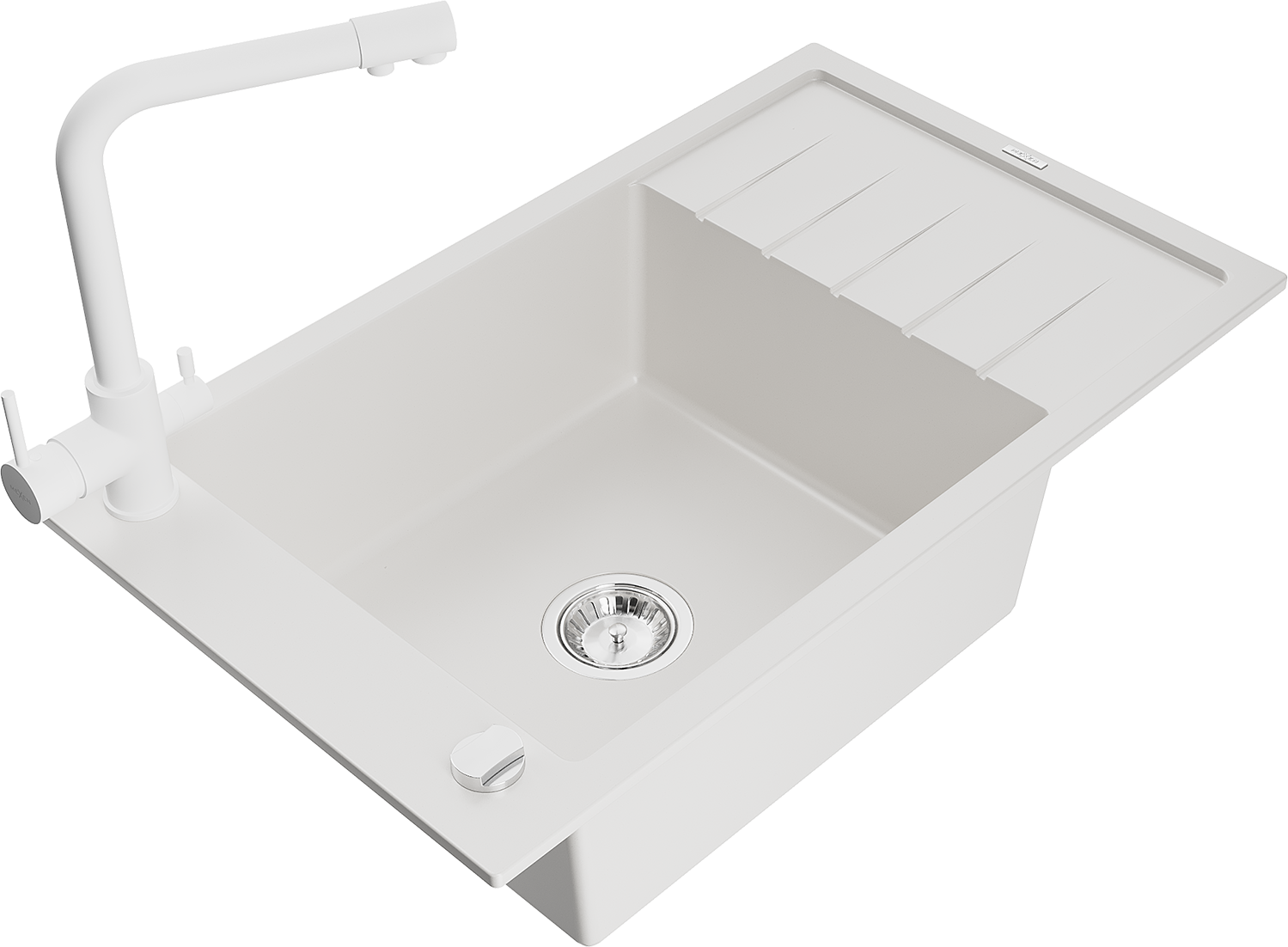 Mexen Elias granite sink 1-bowl with drainer and Duero kitchen tap, white - 6511-20-671600-20