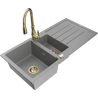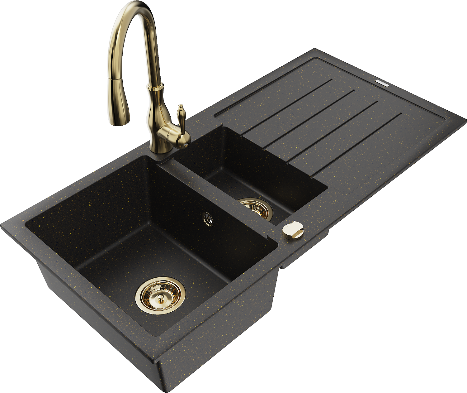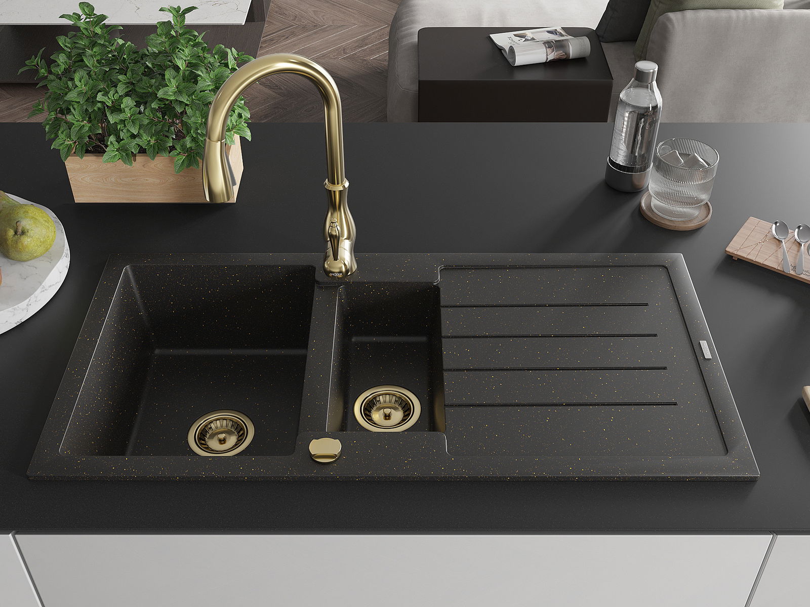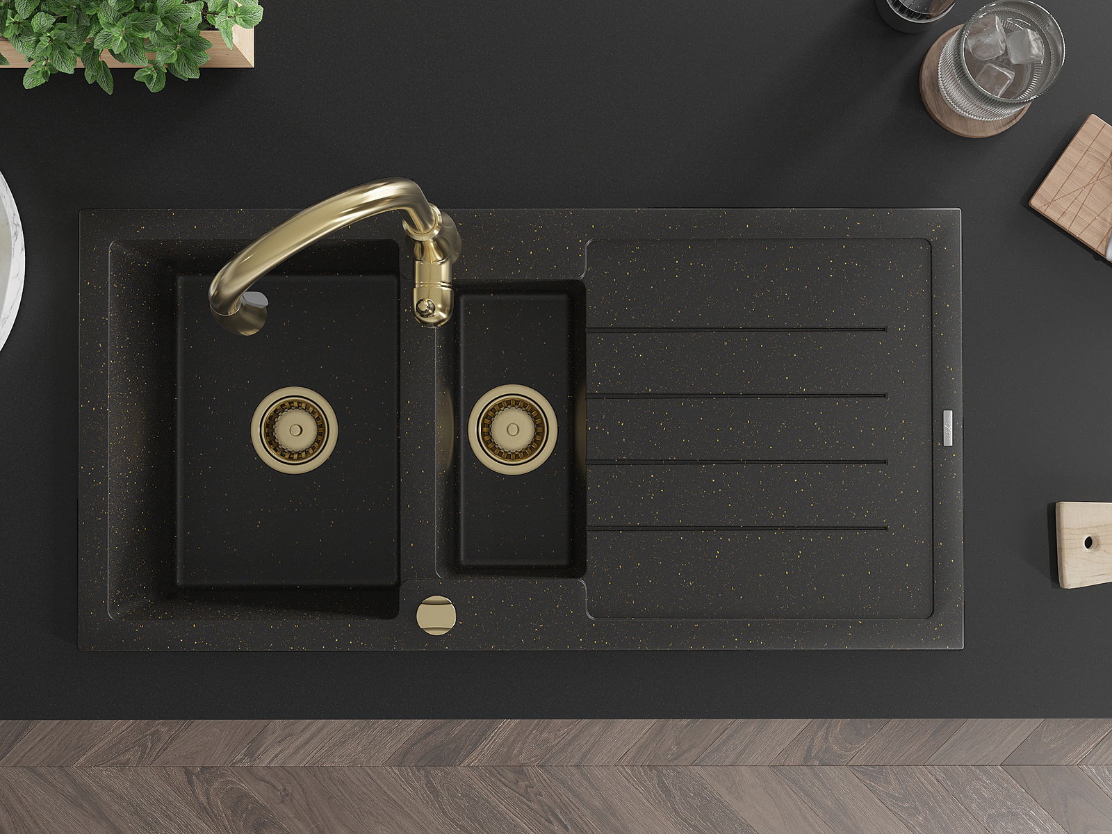 Mexen Andres granite sink 1.5-basin with drainer and Savita kitchen tap, black/gold metallic- 6515-75-672601-50