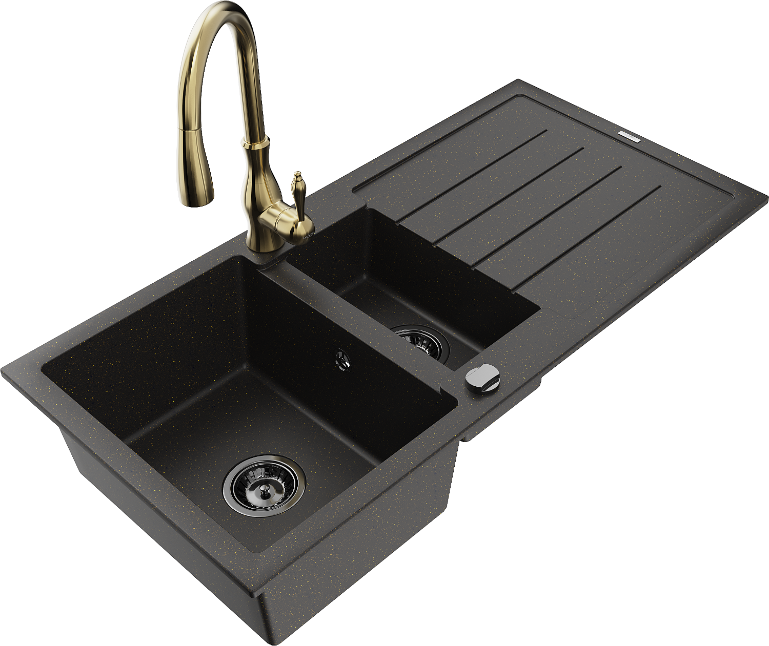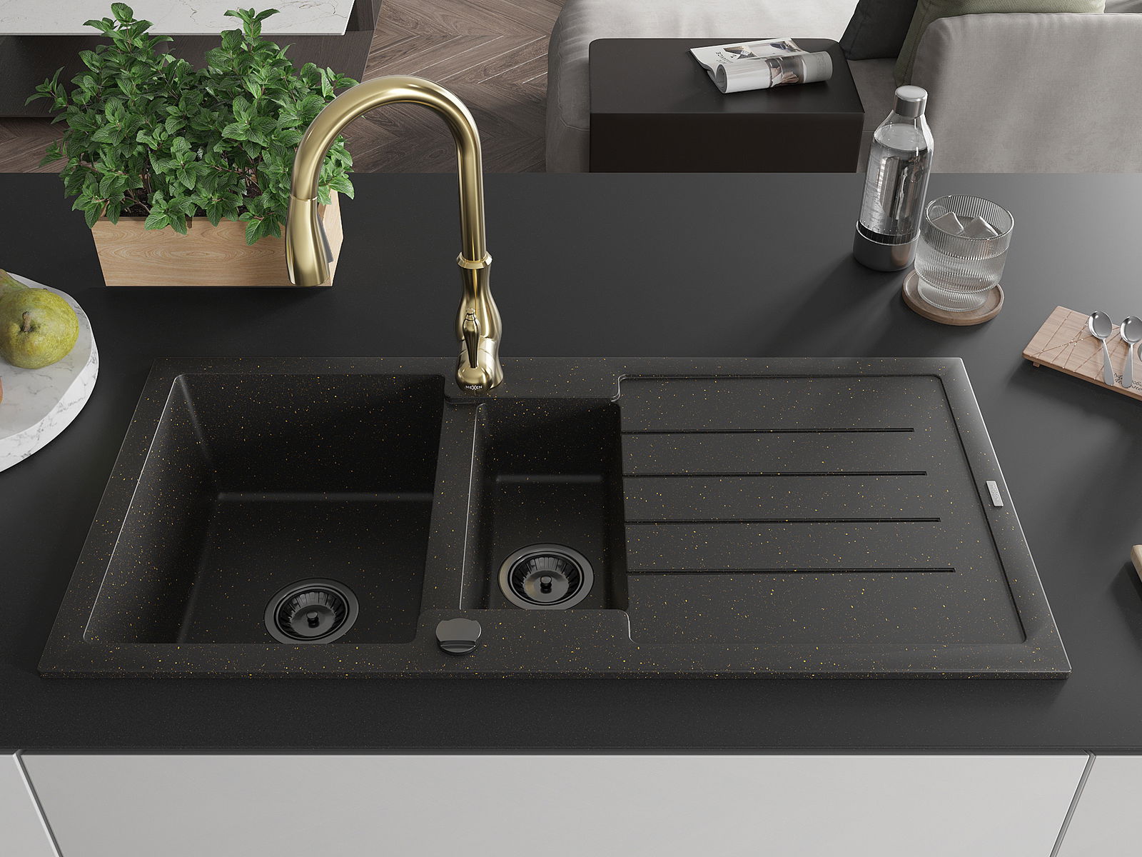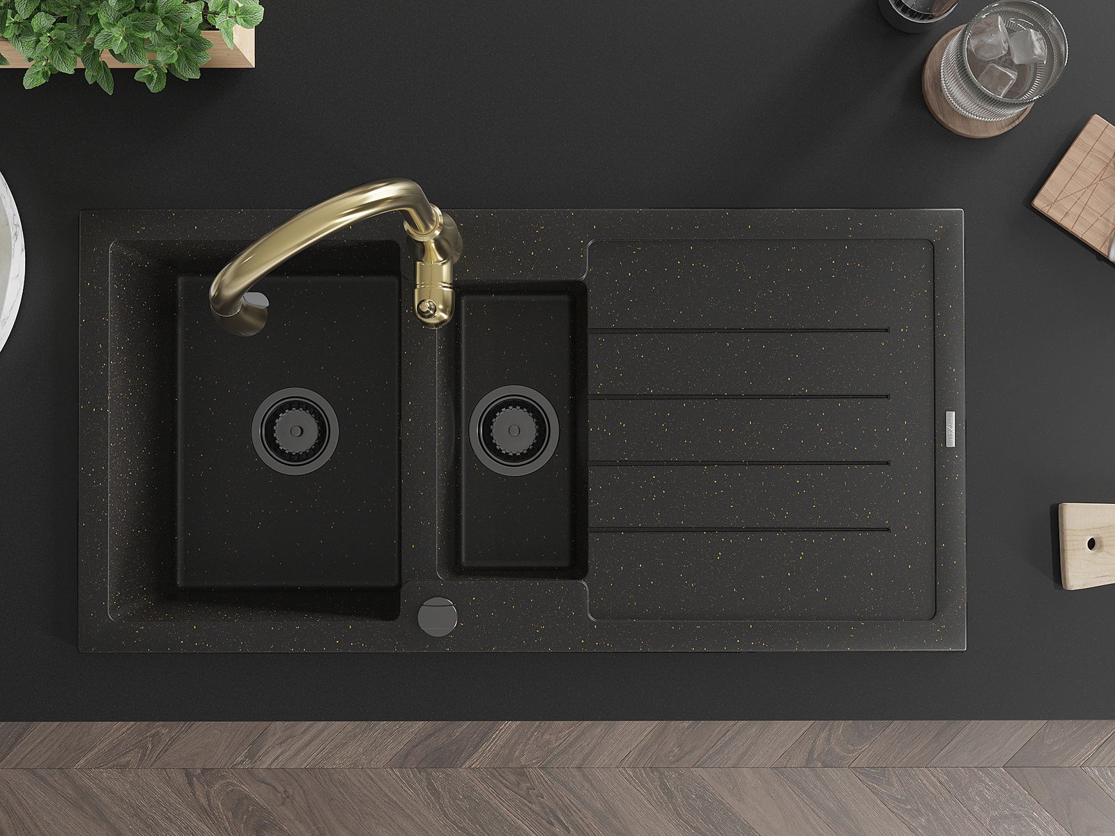 Mexen Andres 1.5-bowl granite sink with drainer and Savita kitchen tap, black/gold - 6515-75-672601-50-B