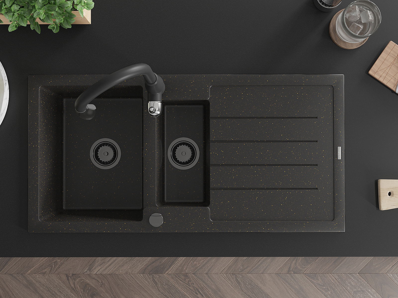 Mexen Andres granite sink 1.5-bowl with drainer and Savita kitchen tap, black/gold - 6515-75-672601-70-B