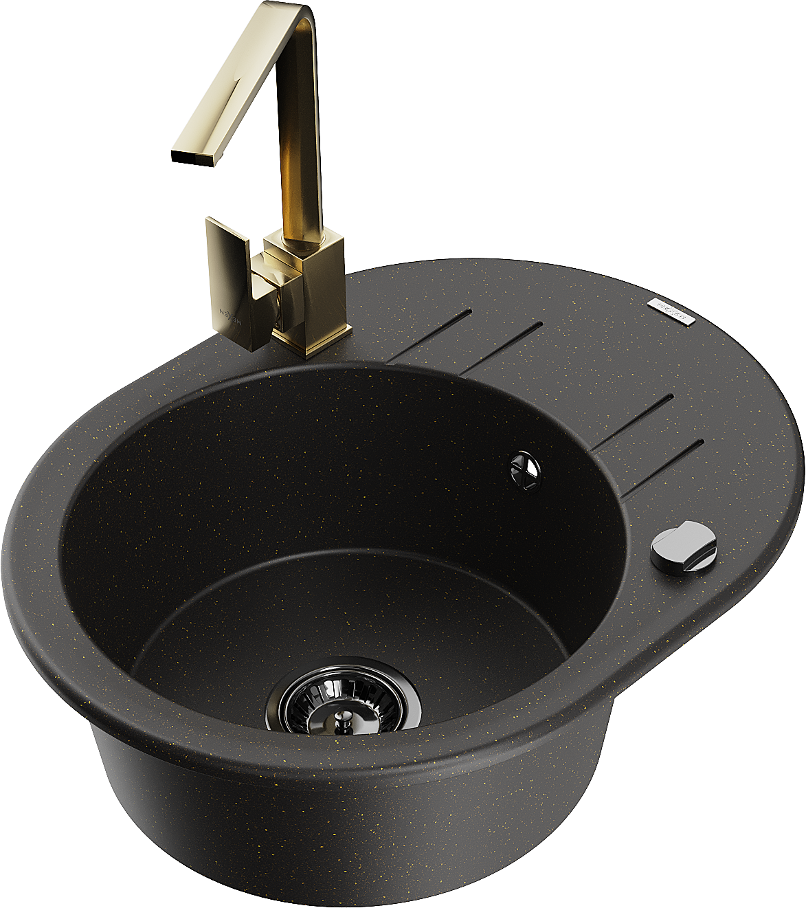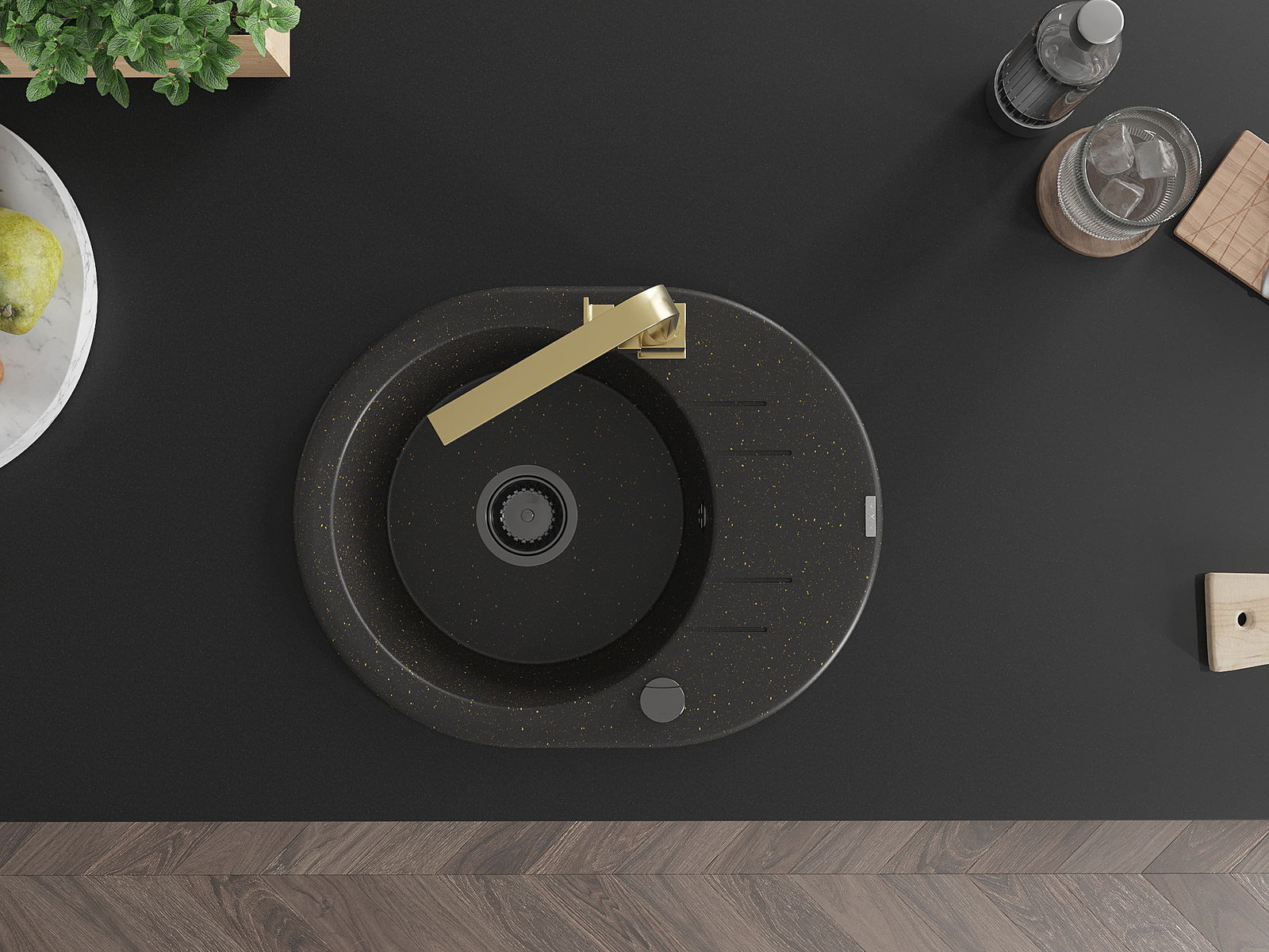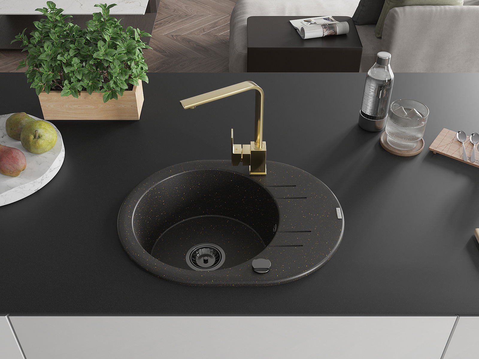 Mexen Kevin 1-bowl granite sink with drainer and Rita kitchen tap, black/gold metallic - 6517-75-670300-50-B
