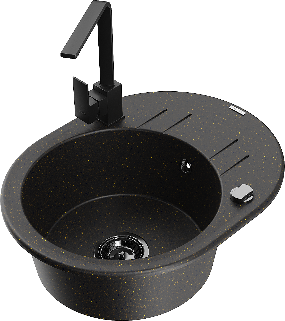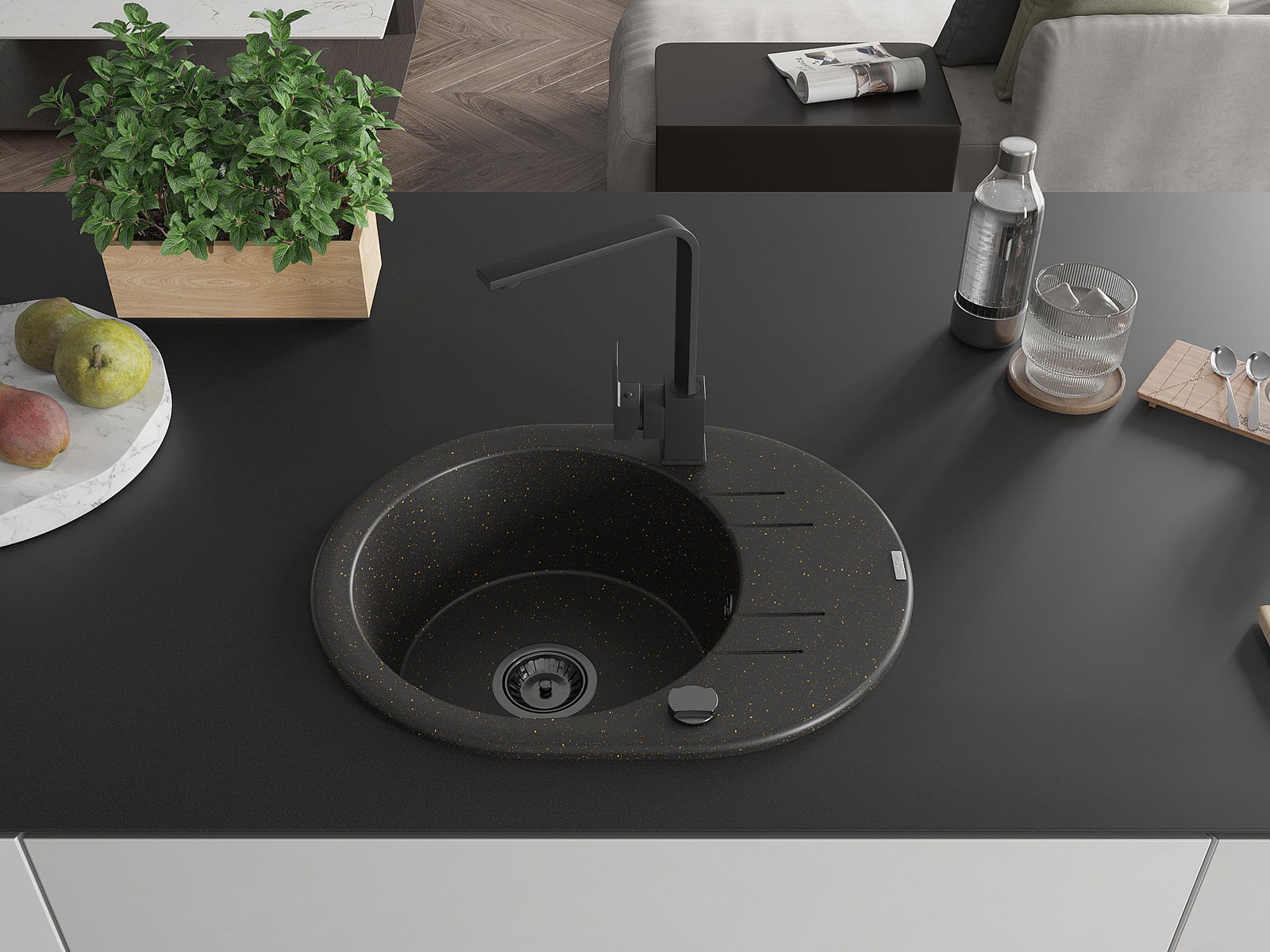 Mexen Kevin 1-bowl granite sink with drainer and Rita kitchen tap, black/gold metallic - 6517-75-670300-70-B