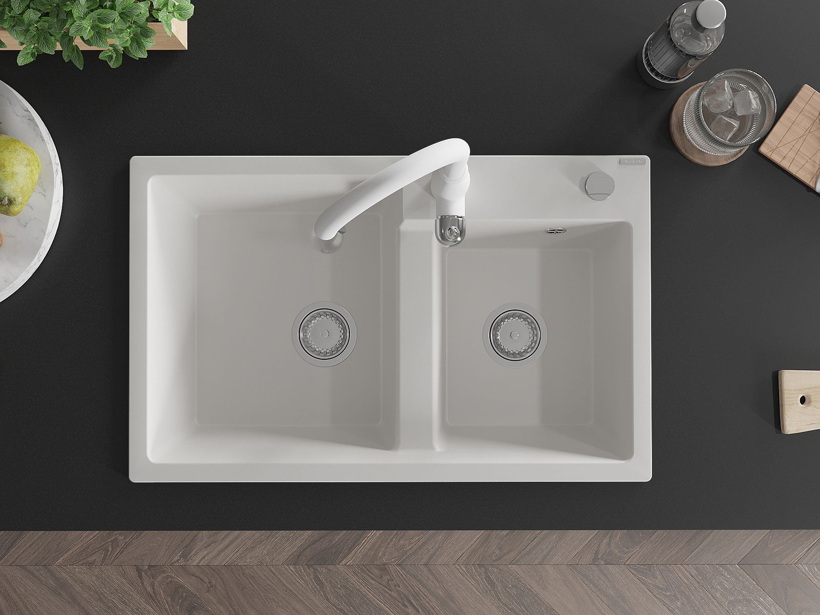 Mexen Tomas granite kitchen sink 2-bowl with Savita kitchen tap, white - 6516-20-672601-20