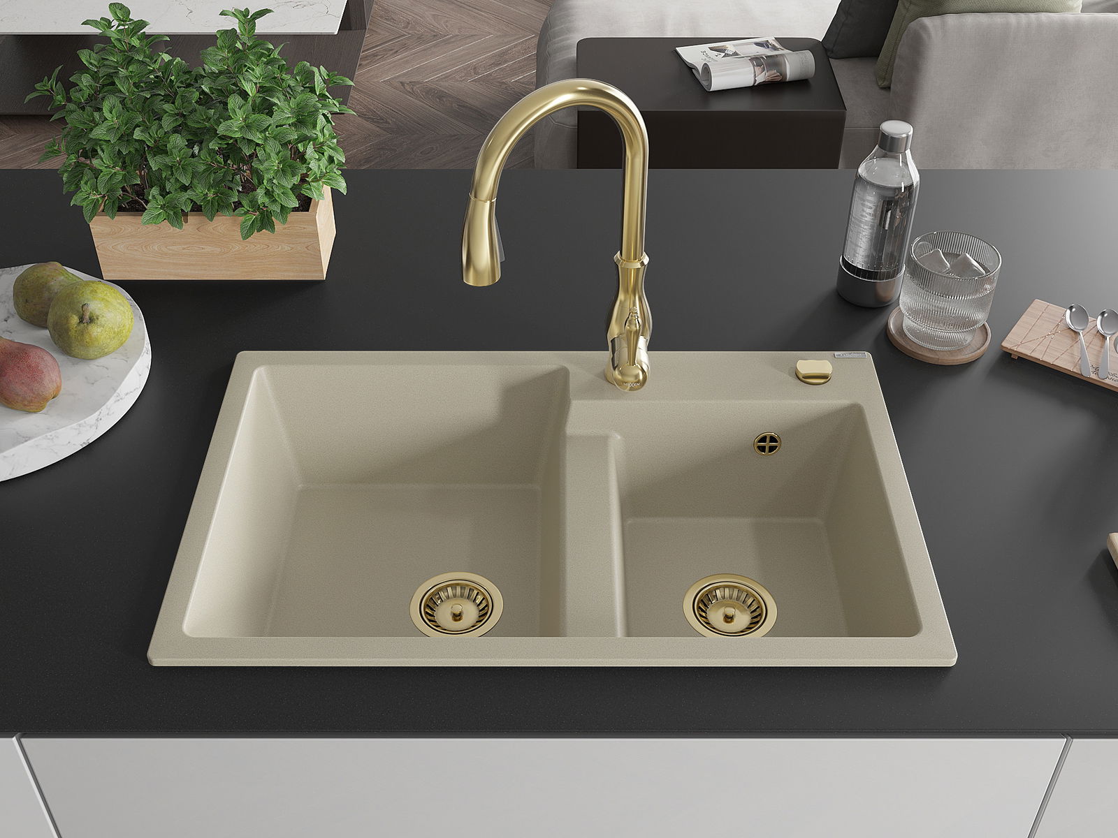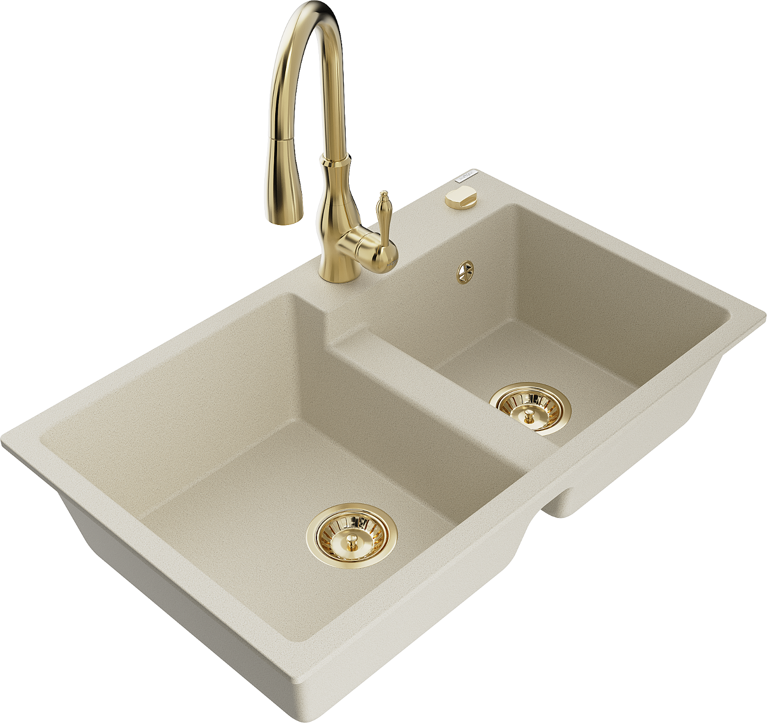 Mexen Tomas granite sink 2-bowl with Savita kitchen tap, beige - 6516-69-672601-50