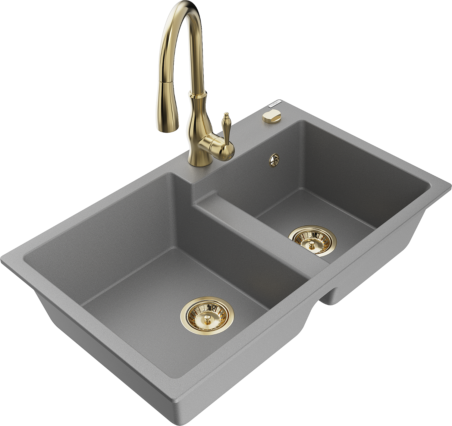 Mexen Tomas granite sink 2-chamber with kitchen tap Savita, grey - 6516-71-672601-50