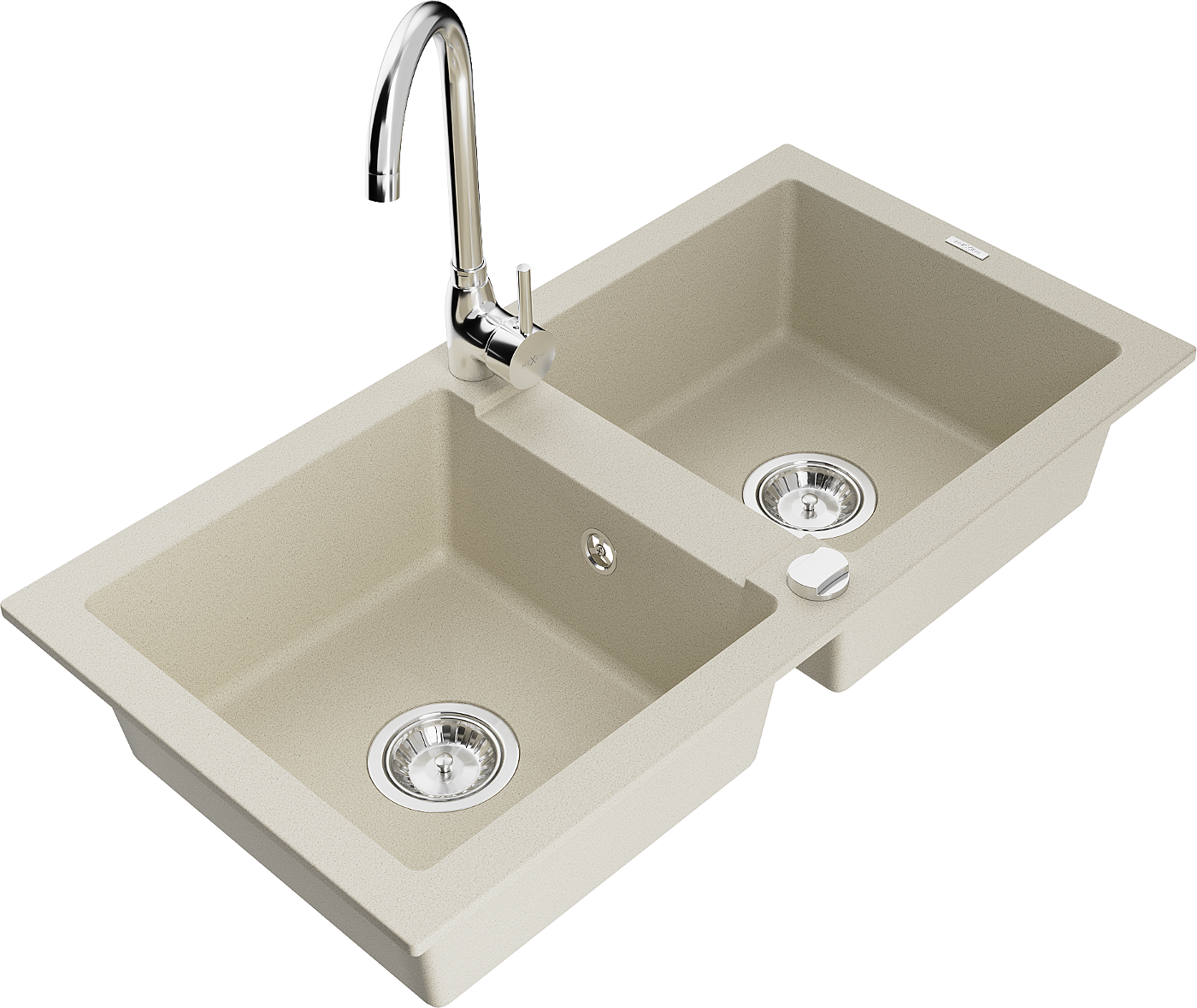 Mexen Mario granite sink 2-bowl with Telma kitchen tap, beige - 6504-69-670200-00