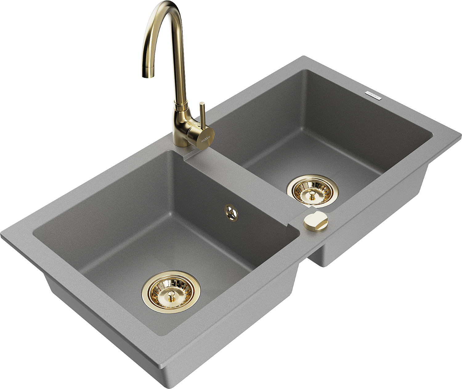 Mexen Mario granite sink 2-bowl with Telma kitchen tap, grey - 6504-71-670200-50