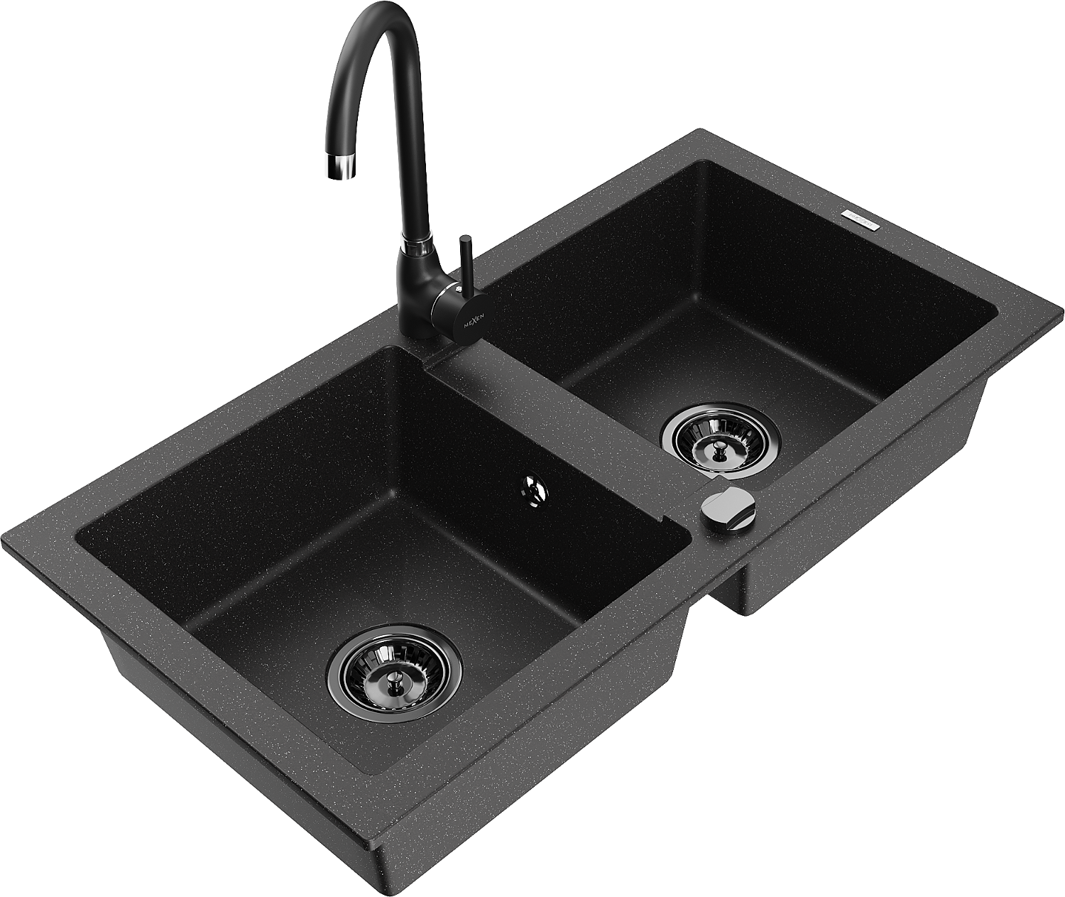 Mexen Mario granite sink 2-bowl with Telma kitchen tap, black/silver - 6504-73-670200-70-B