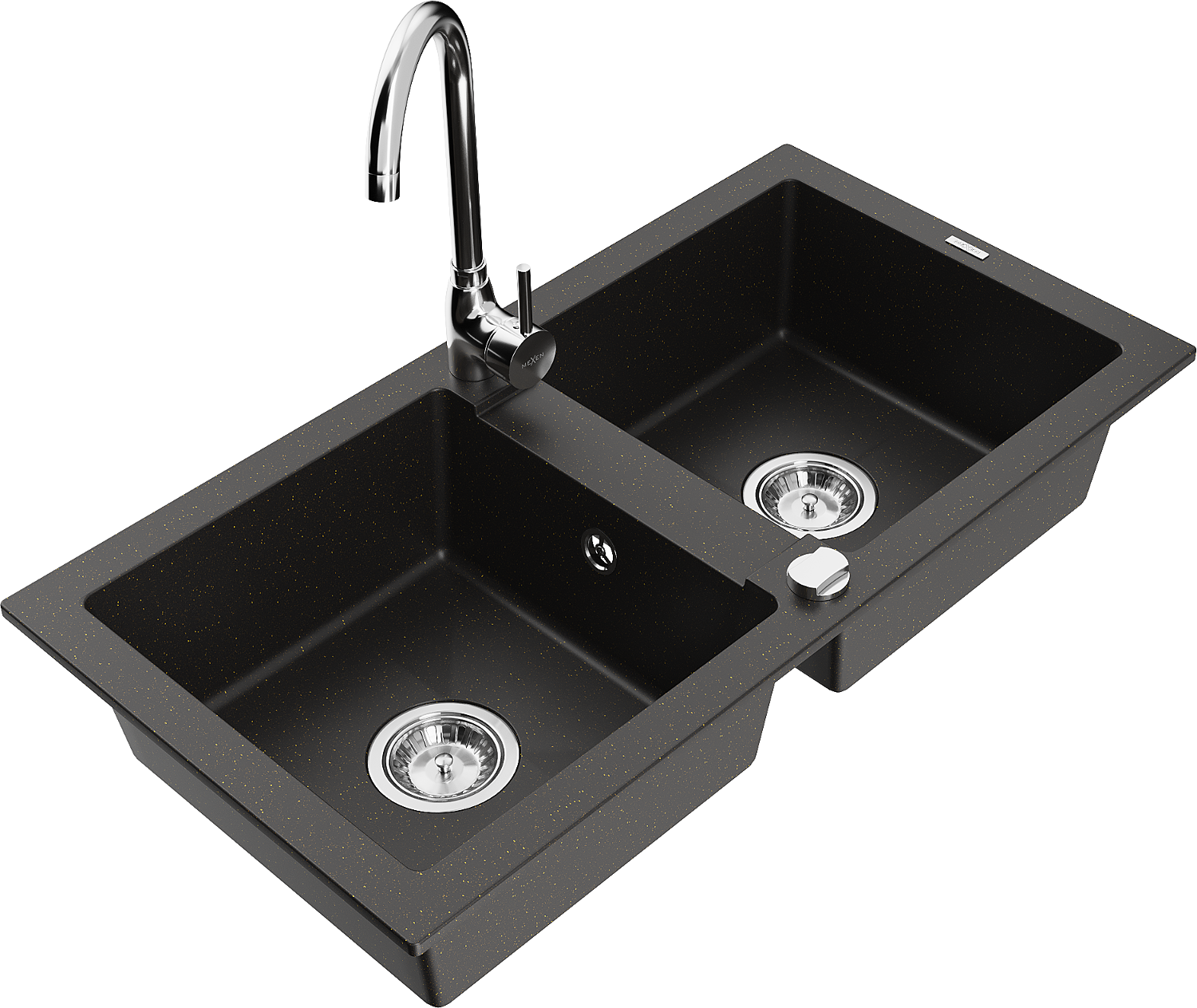 Mexen Mario granite sink 2-bowl with Telma kitchen tap, black/gold - 6504-75-670200-00
